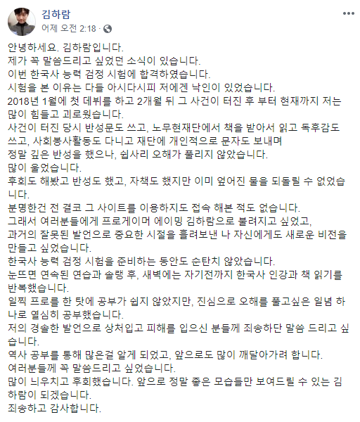 에이밍 선수가 페이스북에 올린 소식은 제가 즐겨 이용하는 사이트 유머게시판에서 처음으로 확인했는데요, 보고 놀랐습니다. 이미 낙인 찍힌 선수라 힘들고 괴로워하는건 당연했겠지만 자신의 잘못을 뉘우치기 위해 노력한 결과와 함께 진정성 있는 글을 보여줬거든요. 그동안 노력한 결과는 한국사능력검정시험 합격으로 증명했고요.