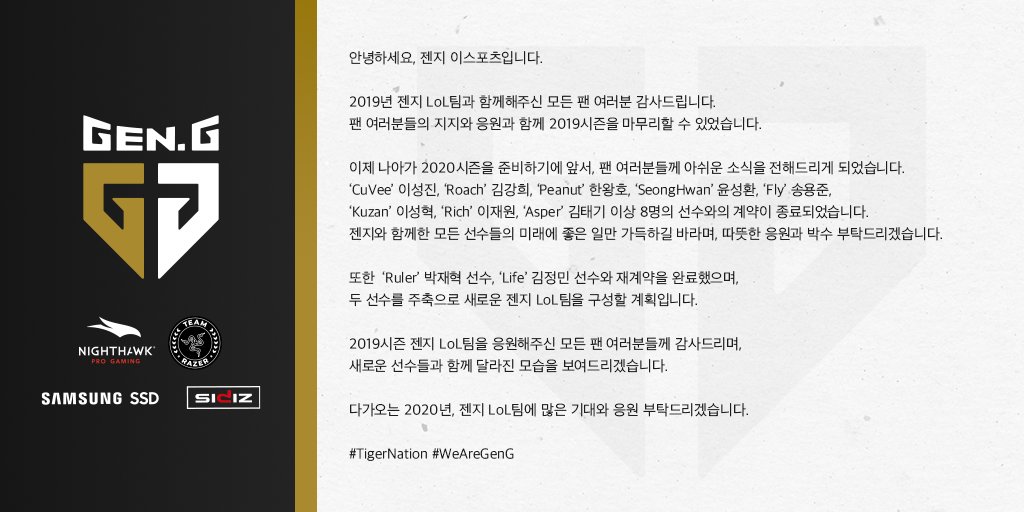 그리고 저는 변함없이 2020 시즌 젠지 LoL팀을 지지하고 응원합니다.