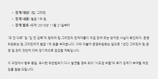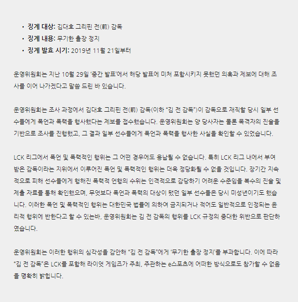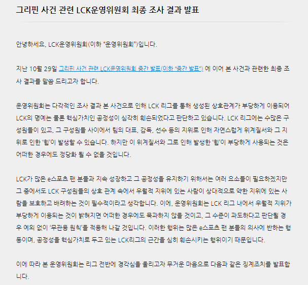 씨맥 감독과 그리핀 사이에 이런저런 공방이 이어지는 가운데 11월 20일 LCK 운영위원회가 최종 조사 결과 발표를 했습니다. 출근해서 일하다가 얼핏 소식을 접했는데 미치고 팔짝뛸 노릇이었어요. 분명 가장 심각한 문제를 가진 것은 스틸에잇과 그리핀인데 김대호 감독이 왜 징계? 그리고 벌금도 아니고, 몇 경기 정지도 아니고, 무기한 출장 정지?