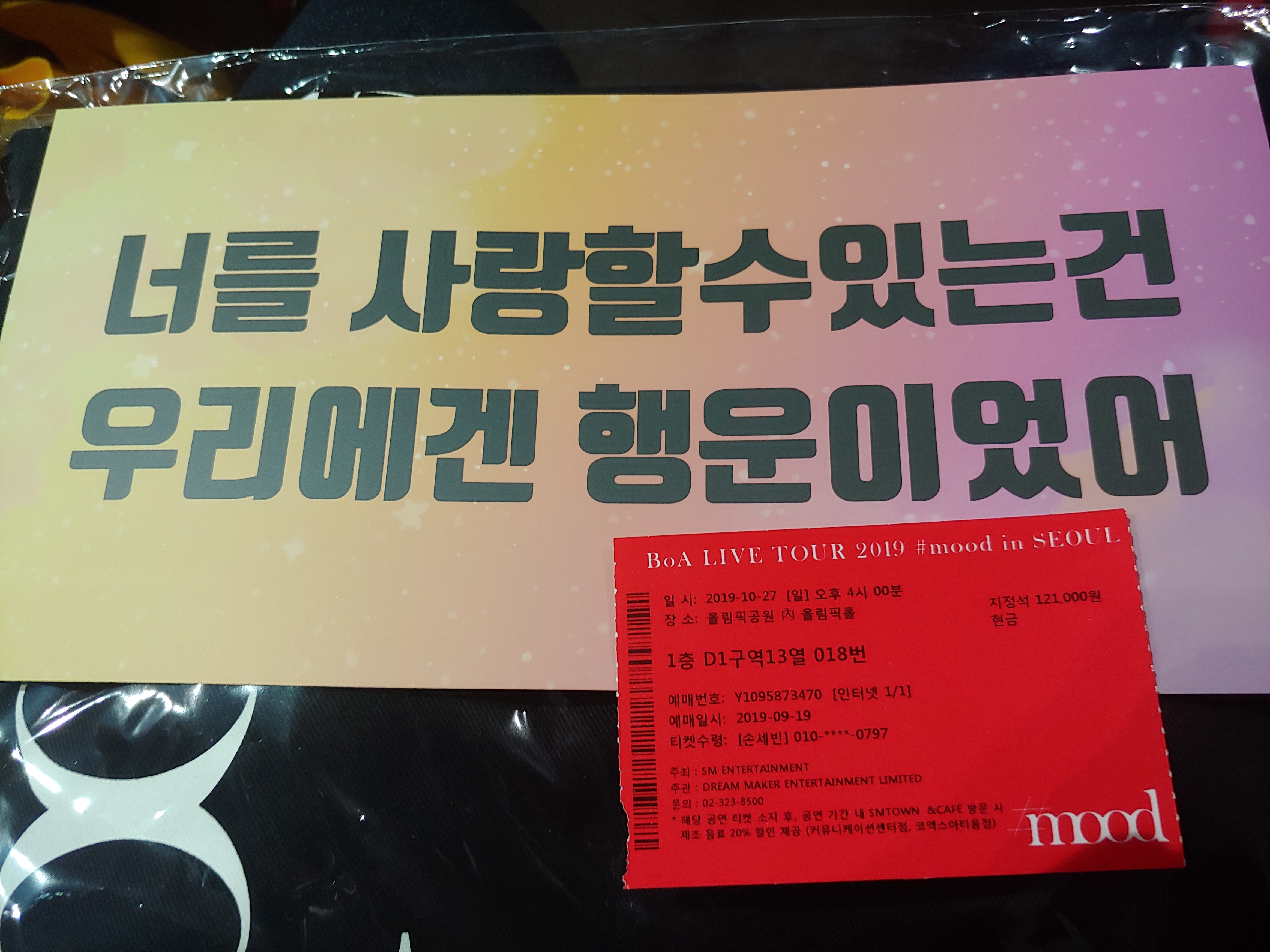 지난 해에 이어 올해도 제가 세상에서 가장 좋아하는 가수 보아의 콘서트, 보아 라이브 투어 2019 무드 인 서울(BoA LIVE TOUR 2019 #mood in SEOUL)이 열렸습니다. 작년에는 호주 일정이랑 겹쳐서 못 가게 되어 울뻔했는데 진짜...올해도 태국 일정이랑 겹쳐서 못 가게 되는줄 알고 패닉이 올 뻔했지만 다행히도 일요일 공연은 볼 수 있었습니다. 인천공항에 오전 도착 후 집에서 1시간 30분 정도 잠잔 후에 콘서트 보러 나갔다 감동하고 돌아온 이야기. ㅋㅋ