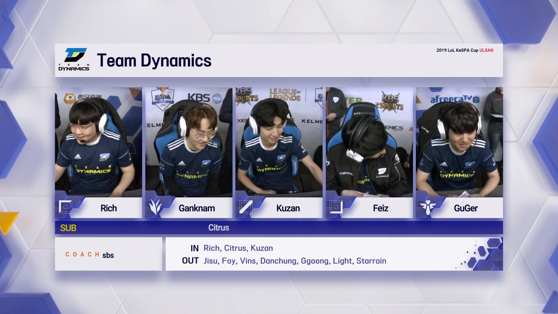 오늘 그룹F에서 승리를 거둔 팀 다이나믹스의 라인업 리치, 갱남, 쿠잔, 페이즈, 구거 5인 선수입니다. 젠지에서 이적한 리치와 쿠잔 선수가 있는 팀이라 오늘 꼭 승리하길 바랐고 제 바람대로의 결과를 보여줬네요. 리치 선수는 이적이 어그러졌을 때 안타까웠는데 그래도 이렇게 합류해서 웃는 모습을 보여주니까 좋더라고요.