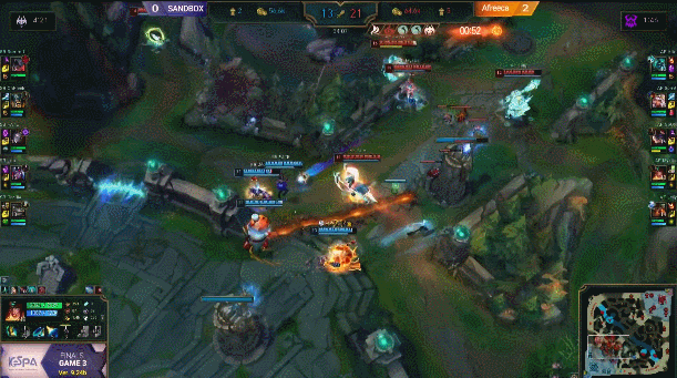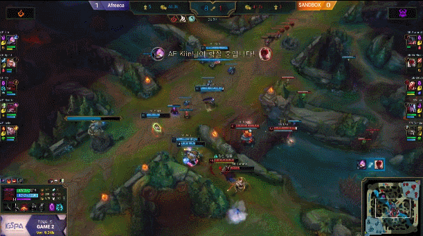 사실 4강전부터 아프리카 모든 선수들이 잘해서 몇몇 선수만 언급하는게 미안할 정도이긴 하지만 스피릿 선수의 키아나와 젤리 선수의 라칸이 전투 때마다 활약을 보여줬다고 말할 수 있을 것 같아요. 2경기 MVP 젤리의 라칸 0킬 0데스 12어시, 그리고 또! 기인 딜량 1위의 위엄과 함께 아프리카 승리.