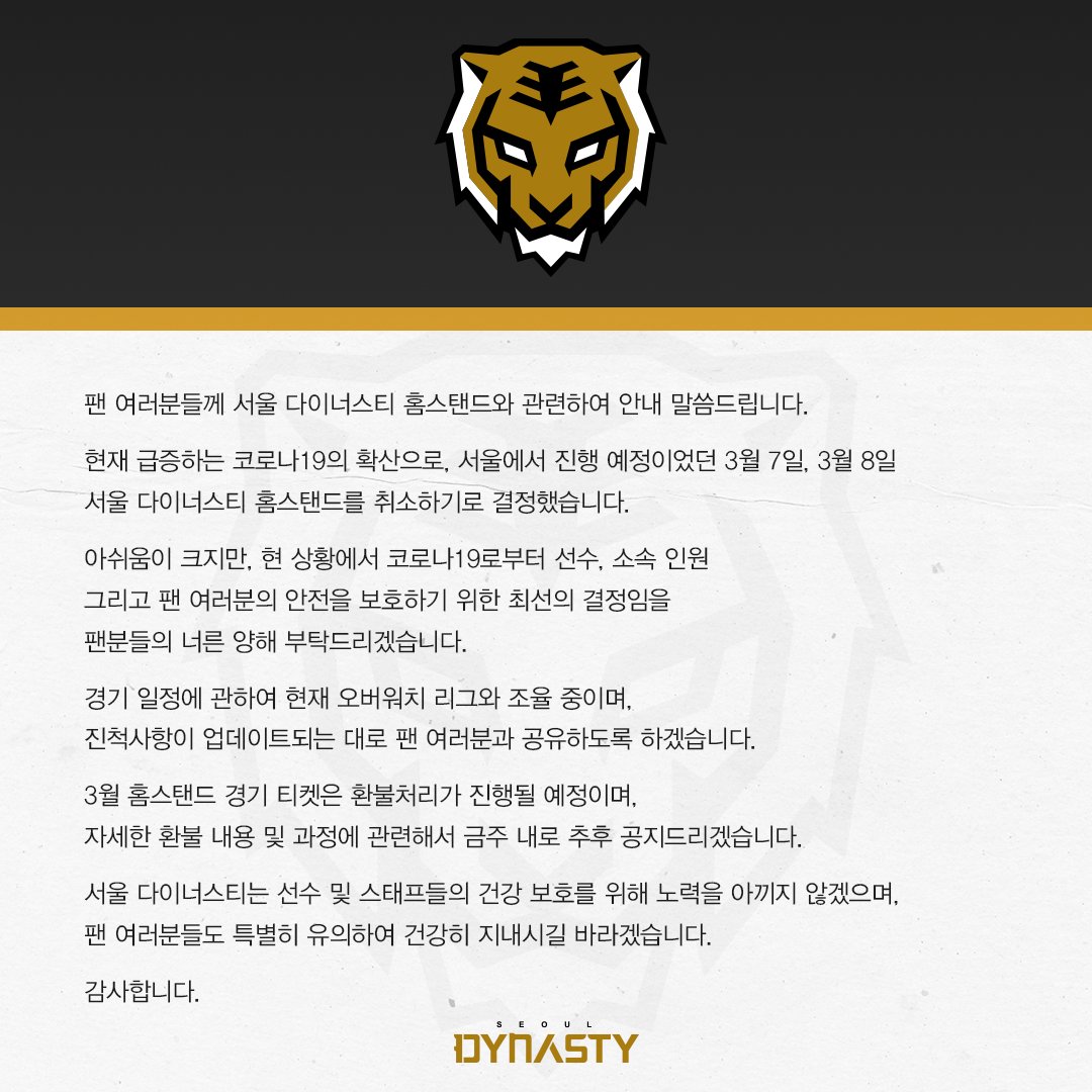 원래는 2020년 3월 7일과 8일 양일간 DDP에서 서울 다이너스티 홈스탠드가 진행될 예정이었지만 현재 코로나 확산이 걷잡을 수 없이 커지면서 취소됐습니다. 젠지&서울 다이너스티팬인 제 입장에서는 너무나 아쉬운 소식이지만 현재로써는 정답이라고 생각하는 옳은 결정을 내려서 다행입니다. 오버워치 리그 선수들을 서울에서 보는 일정은 이렇게 미뤄져 버렸지만 하루빨리 사태가 진정되어 리그 관련 좋은 소식을 들을 수 있었으면 좋겠어요.