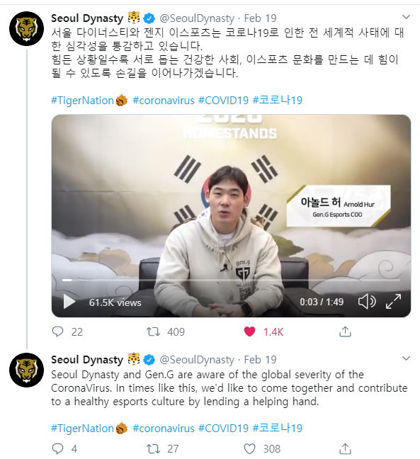 이번 취소 결정에 앞서 젠지(Gen.G)의 아놀드 허(Arnold Hur) COO는 트위터를 통해 서울 다이너스티 3월 홈스탠드 수익 전액을 비롯해 젠지&서울 다이너스티 MD 판매 수익, 서울 다이너스티 인게임 스킨 수익 전액을 코로나로 어려움을 겪는 사람들을 위해 기부한다고 밝힌 바 있습니다. 홈스탠드 수익이 없어지면서 어쩔 수 없이 젠지의 실행과 발표 내용은 좀 달라지겠지만 현재의 심각성을 충분히 인지하고 여러 가지로 노력하는 모습을 보여주는 젠지에 박수를 보냅니다.