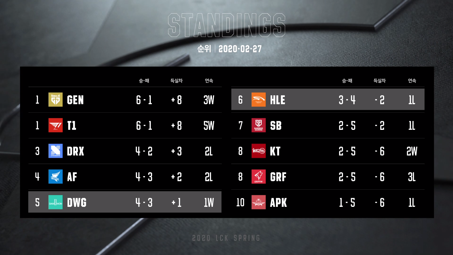 젠지가 아프리카에 2:1로 승리하고, 이후 이어진 매치에서 담원이 한화에 2:1로 승리하면서 2020 스프링 시즌 LCK 순위는 이렇게 되었습니다.(20년 2월 27일) 젠지는 깔끔한 2:0 승리를 거뒀다면 단독 1위에 올랐을텐데 대퍼했던 1경기가 참 아쉽네요. 그래도 1위는 기분 좋은 것!