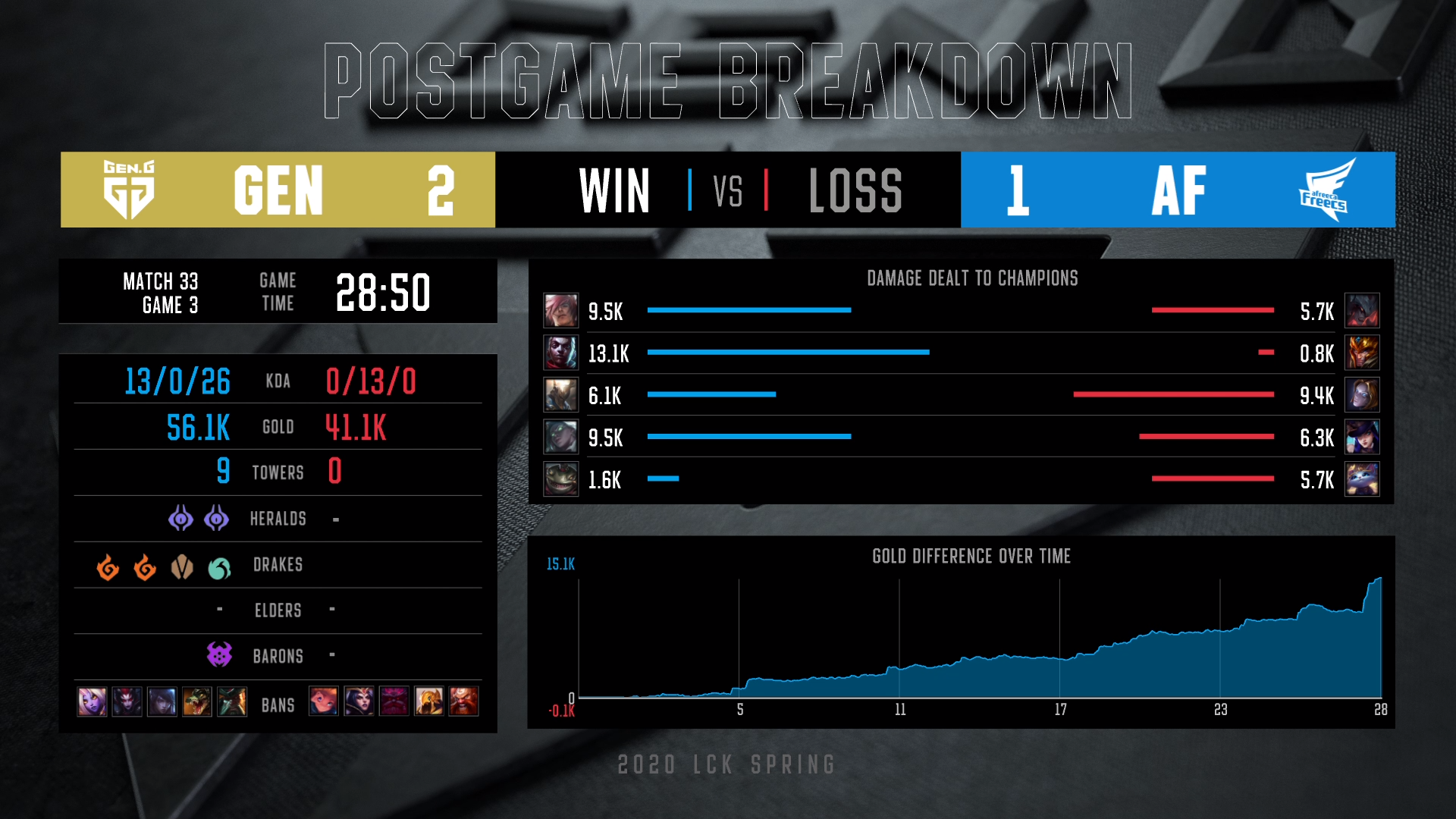 젠지와 아프리카 3경기는 굳이 경기를 보지 않고 지표만 봐도 후덜덜하다는 생각이 들게 만들 정도로 압도적이었습니다. 플레이 타임 28분 50초, 13:0, 골드격차 1만 5천, 타워 9:0, 전령 2:0, 드래곤 4:0, 바론 1:0 '진짜' 퍼펙트게임이 나온거죠.