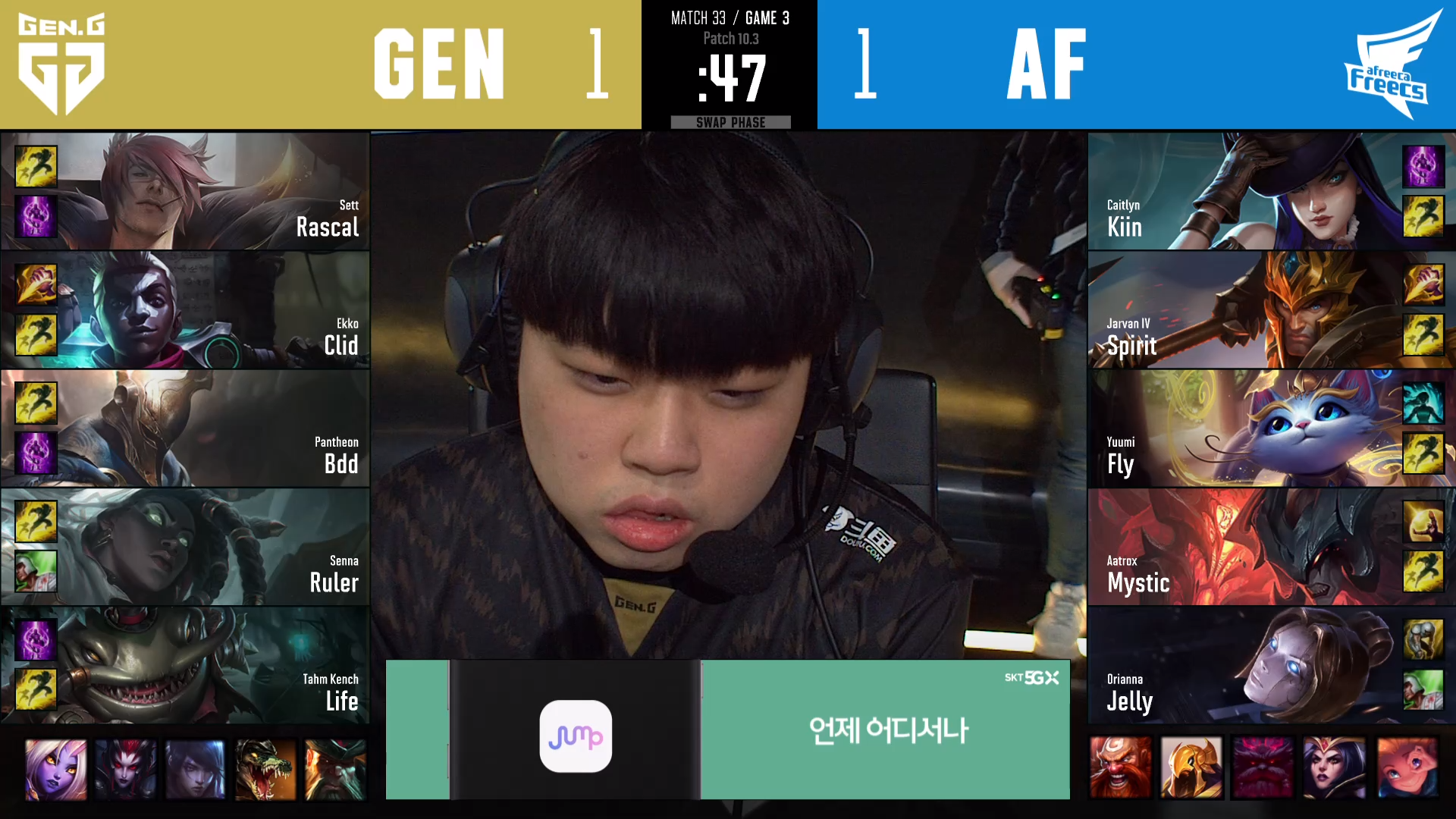 젠지는 요새 핫하다는 단식 세나+탐켄치 조합과 함께 에코 정글을 들고 나왔는데 아프리카는 요새 잘 나오지 않은 케이틀린을 선호하는 모습을 이번 매치에서 보여주더라고요. 그리고 만약 오리아나가 판테온을 압박하는 라인전을 보여줬다면 혹시 모를 픽밴이었으나...