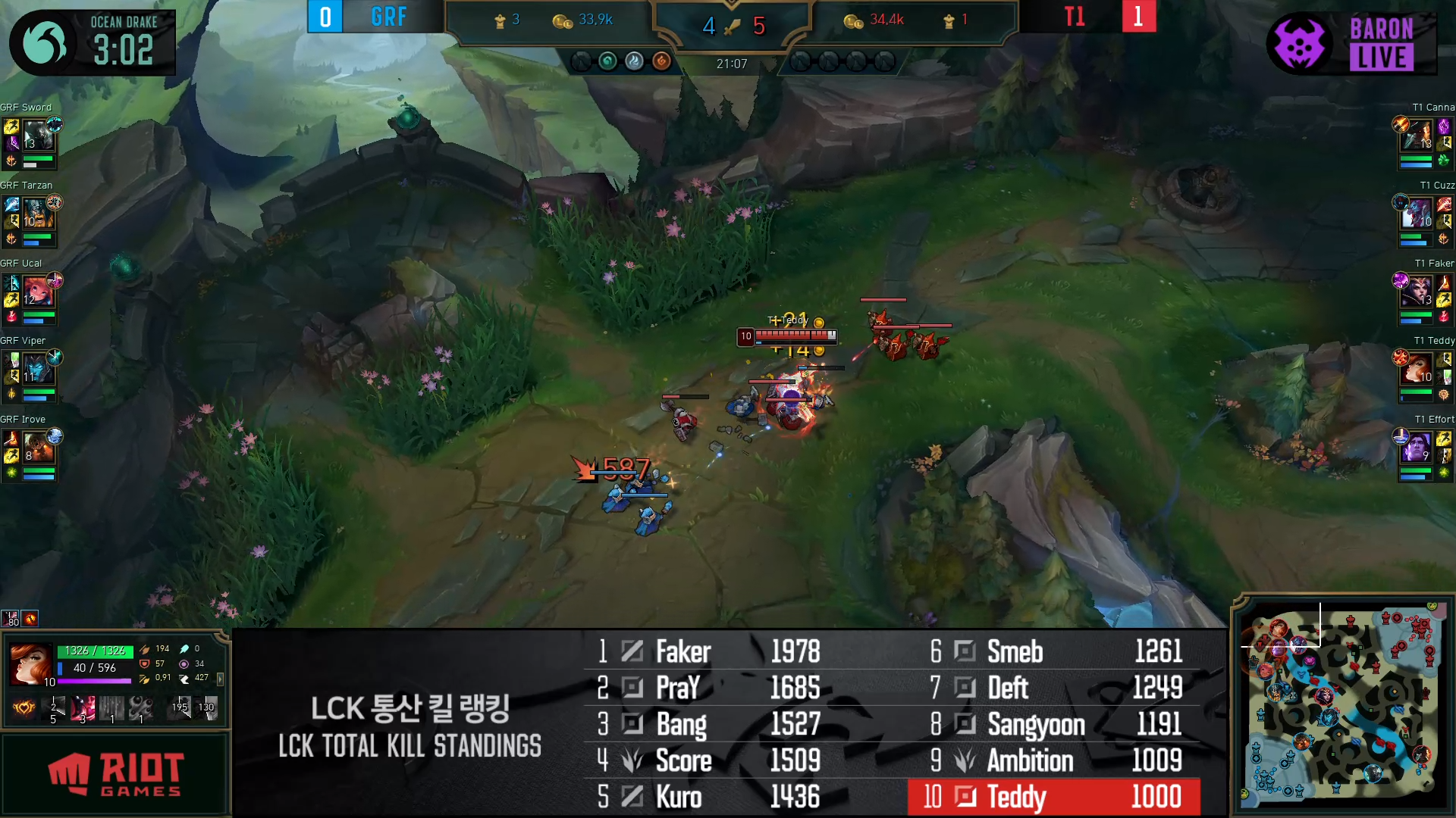 뭔가 이런 장면이라 비참해보이기도 하지만 ㅋㅋ 테디 선수도 한타에서 기여했고, 상체힘을 바탕으로 한타 대승도 거뒀으니까 명예로운 미스 포츈이라 합시다. 이렇게 테디 선수는 LCK 10번째 1000킬의 주인공이 되었습니다. 여기까지 고생했고, 앞으로도 T1 선수들과 함께 멋진 경기들 잔뜩 보여주는 테디 선수였으면 하네요.