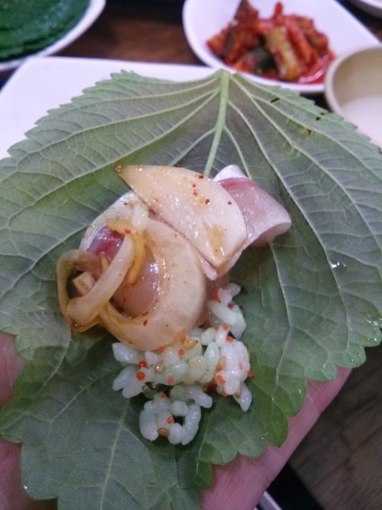 그렇더라도 의외로 맛있는거였지 껍데기 때문에 좀 싫었는데 깻잎에 싸서 먹는 이 방법을 사용하니 존맛탱이었습니다. 깻잎으로 가리니까 고등어 껍데기도 안보이고 양념이랑 밥이 함께하니까 너무나 맛난 것~