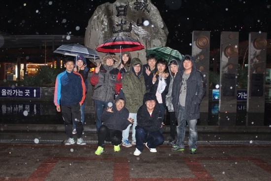 먼저 섭지코지에 갔지만 비바람이 너무 심해서 아쉬움을 뒤로 하고 성산일출봉으로 달렸습니다. 그래도 뭘 할 수 있는 상황은 아니라 여기에서도 인증샷만 달랑 남겼어요. 비가 내렸었는데 사진은 눈같은 느낌. ㅎㅎ