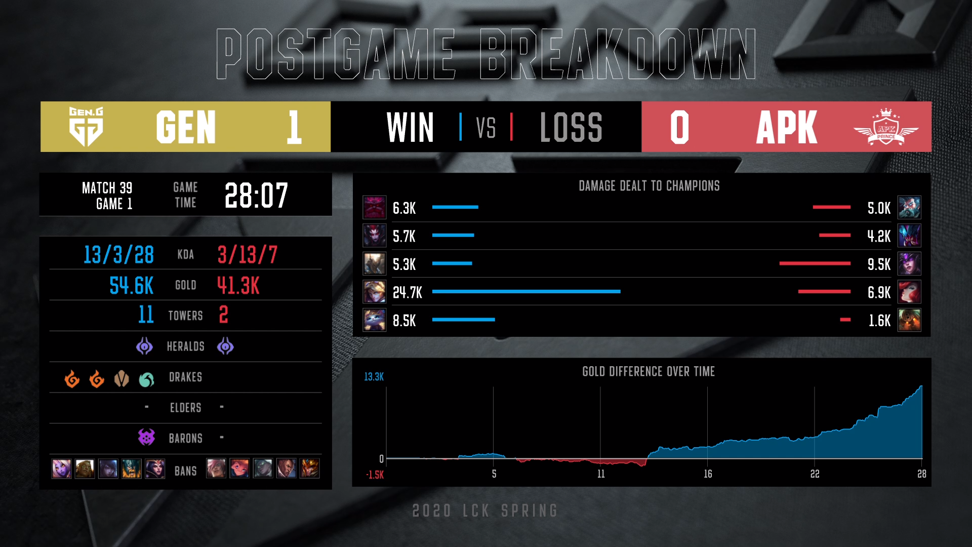 2020년 3월 1일 젠지(Gen.G) vs APK 프린스 매치의 승자는 너무나 당연하게도 젠지였습니다. 경기 내용도 일방적이어서 팬이 아닌 입장에서는 '졸려운거 보니 젠지 승' 그대로인 경기였을 것 같아요. 하지만 팬 입장에서는 당연한 승리를 예상하는 경기조차도 쫄린다는거. 비디디 선수의 생일이기도 한 이 날은 젠지 승리의 날이면서 룰러 선수가 올 시즌 첫 POG(Player of the Game)를 받은 날도 되었네요.