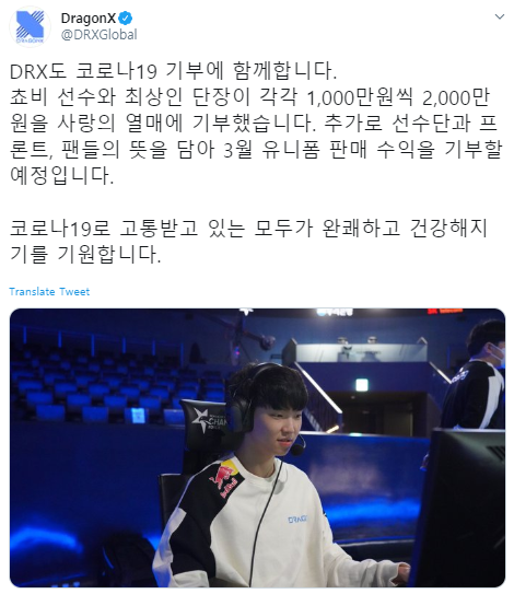 이 밖에도 징동 로컨&진에어 타나 형제의 기부나 DRX팬들의 기부 동참 등 훈훈한 소식들이 많이 들려오는 것을 보면 위기 속에서도 비추는 빛이랄까요? 기부는 절대로 강요해서는 안되는 것이기 때문에 이야기하는 것이 조심스러울 수 밖에 없습니다. 그치만 자발적으로 참여하고 있는 선수 및 관계자, 팬들에 대한 칭찬은 아무리 해도 부족하지 않다고 생각해요.