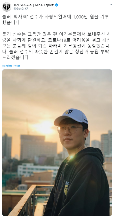 젠지에서는 비디디 선수가 생일을 앞두고 500만원 기부 소식을 알리면서 포문을 열었습니다. '팬들이 당당하게 응원한다'고 말할 수 있는 그런 선수가 되고 싶다고 하는 비디디 선수 참 멋지더라고요. 이어서 3월 7일 오늘은 룰러 선수의 1,000만원 기부 소식도 전해졌습니다. 저의 최애팀 젠지 선수들도 코로나19 극복을 위한 기부에 참여해주니까 너무 고맙고 좋네요.