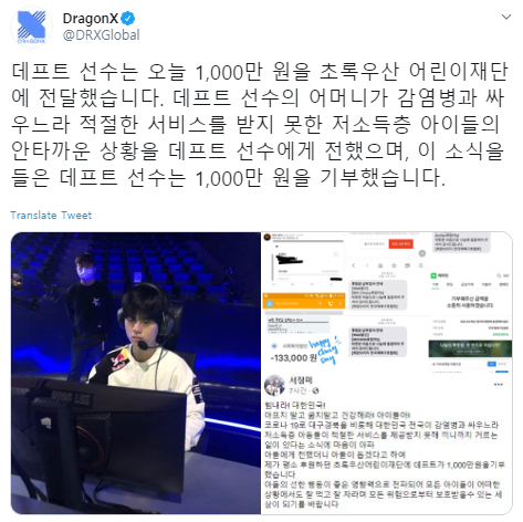 DRX는 쵸비 선수와 최상인 단장이 각각 1,000만원씩 기부했다는 소식을 SNS로 알렸습니다. 그리고 얼마 있지 않아 데프트 선수의 1,000만원 기부 소식도 전해졌어요. 데프트 선수 어머니의 SNS를 통해서 알려졌고 DRX에서도 제가 가장 애끼는 두 명의 선수라서 더 뿌듯했습니다.
