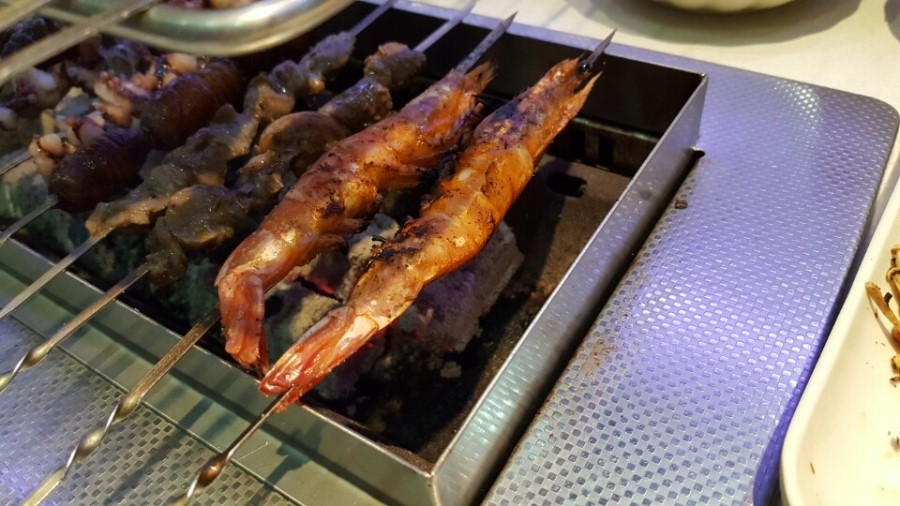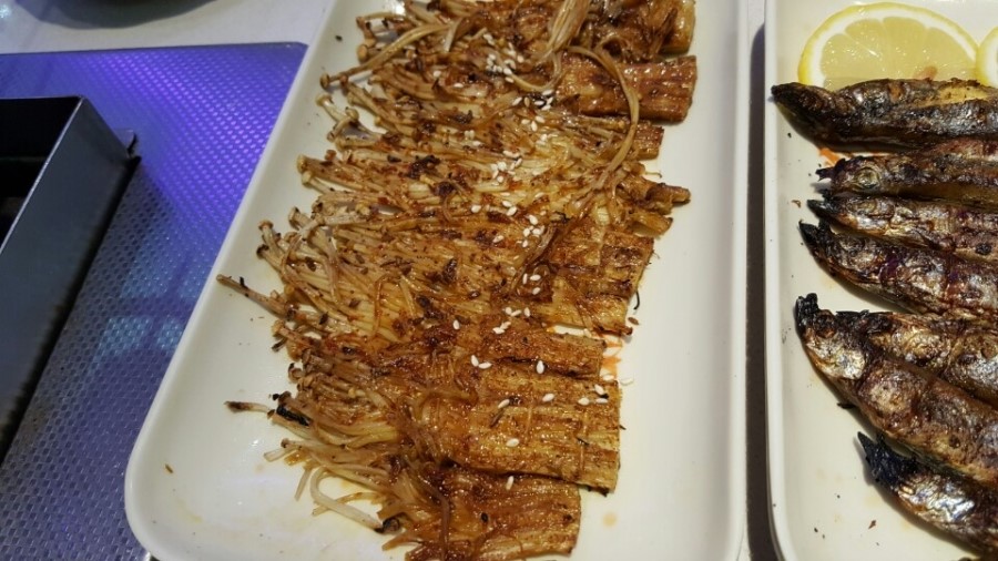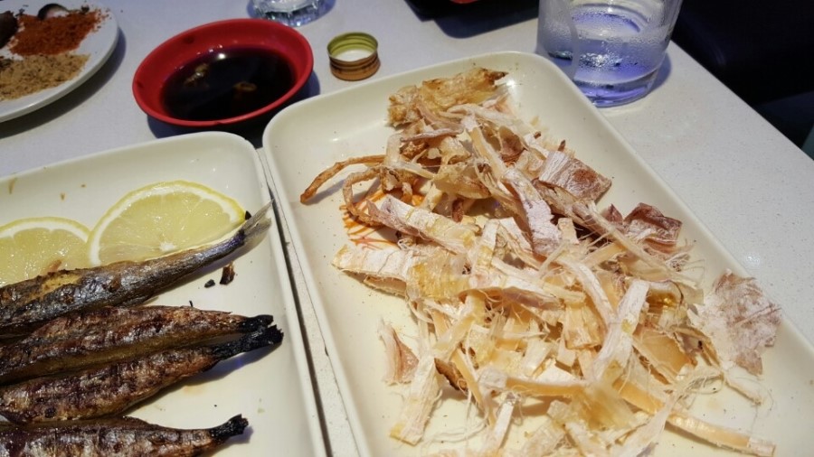 이 외에도 다양한 메뉴들이 있었습니다. 마른 안주가 있는 곳이라면 절대로 빼놓지 않고 시키는 세일이의 페이보릿 마른 오징어와 구워먹는 꽃빵, 맛있진 않지만 뭔가 손이 가는 팽이버섯 구이, 그리고 평소 껍질까기 귀찮아서 잘 안 먹지만 쫄깃한 살이 좋았던 새우까지~