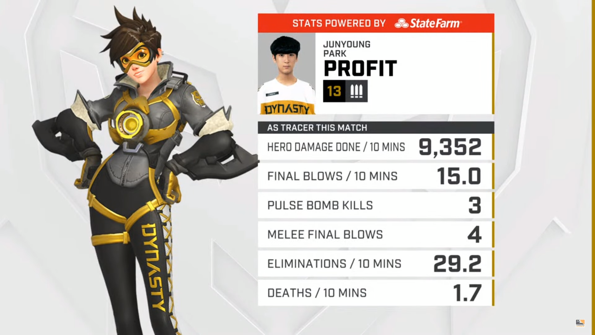 토비 선수의 바티스트도 그렇고 모든 선수들이 잘해줬지만 그래도 이번에 저는 POTG를 탄 프로핏 선수의 플레이가 정말 좋았습니다. 런던 소속일 때 가장 인상깊었던 프로핏 선수가 서울 마크를 달고 활약하니까 묘했지만 위의 스탯에서 보이는 것처럼 트레이서가 장난 없었어요. 특히 10분당 막타 15킬에 1.7 데스라니 후덜덜합니다.