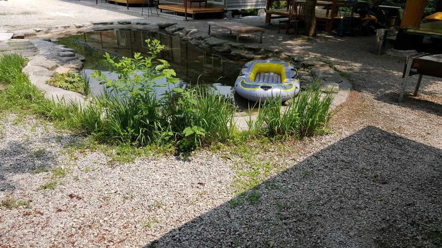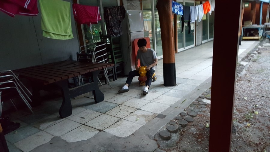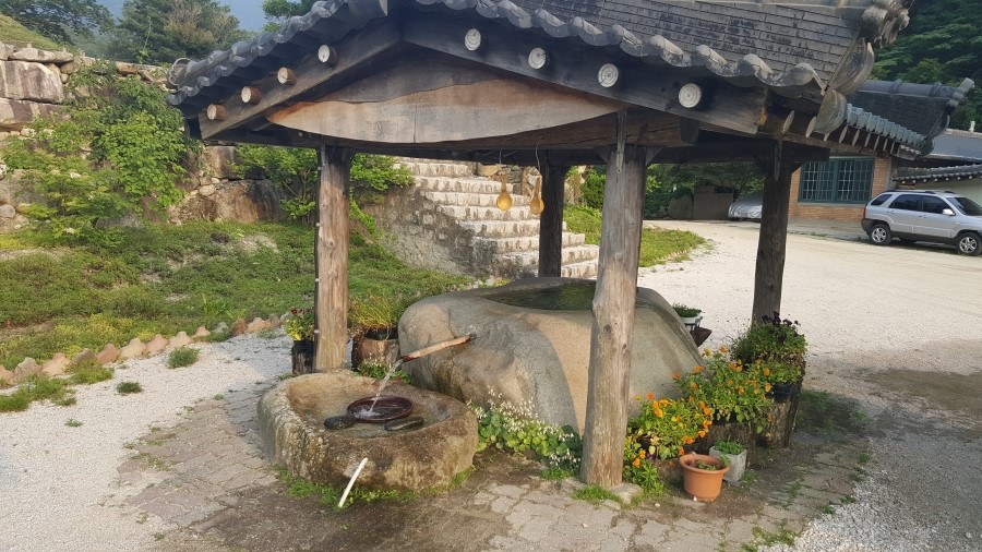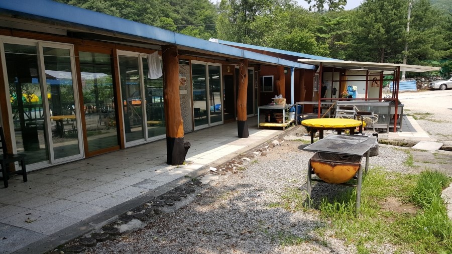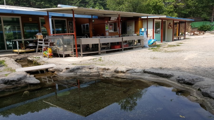 텅 빈 집을 보며 느낀 아쉬움은 뒤로 하고 고향산천의 비주얼입니다. 숙소가 모인 곳 중앙에는 가족 단위로 놀러왔을 때 애기들이 놀 수 있을 정도의 물도 있어서 참 좋아요. 대규모 단체 손님이 놀 수 있는 홀도 있구요~