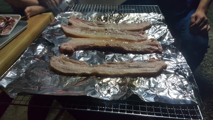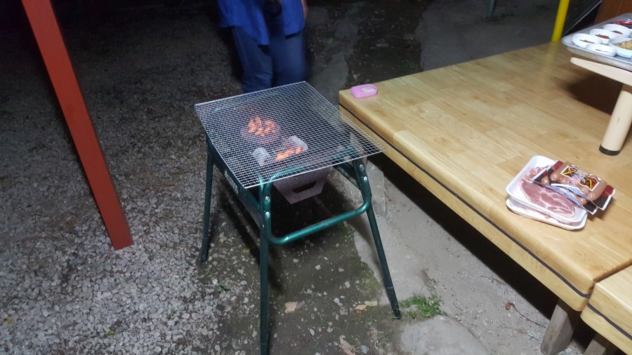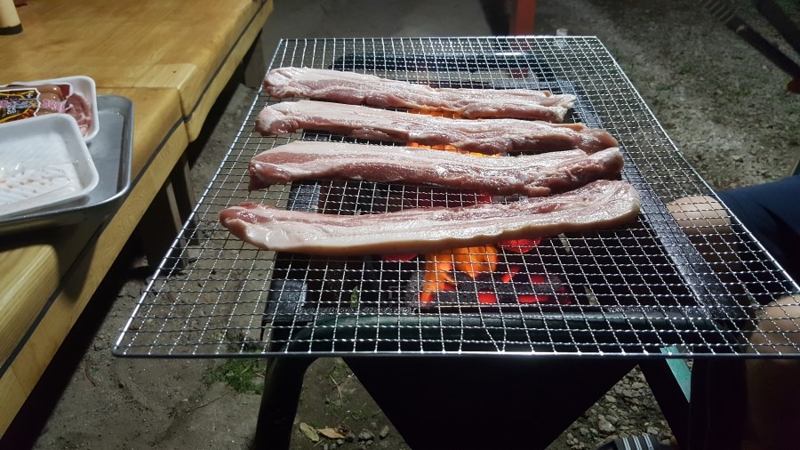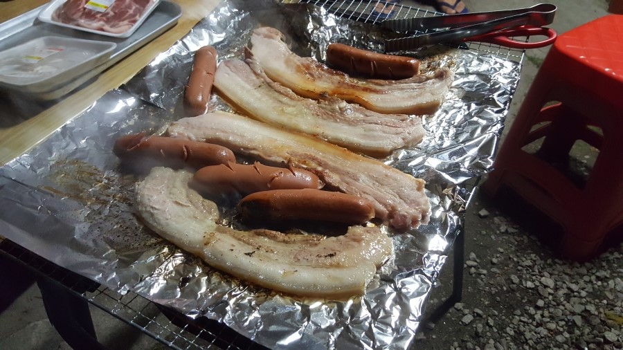 계곡 여행의 메인은 뭐다? 역시 숯불로 구워먹는 고기죠! 고향산천 주인(아들) 강철이가 준비해주는 숯 통 위에 고기를 올려놓고 지글지글 구웠습니다. 이 날은 맛있는 소세지도 함께~~