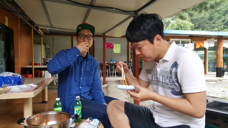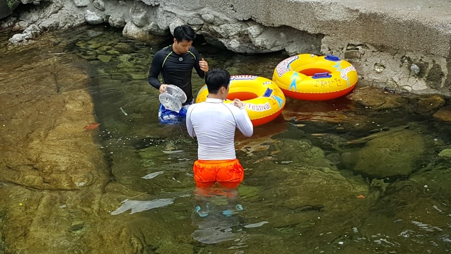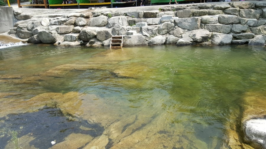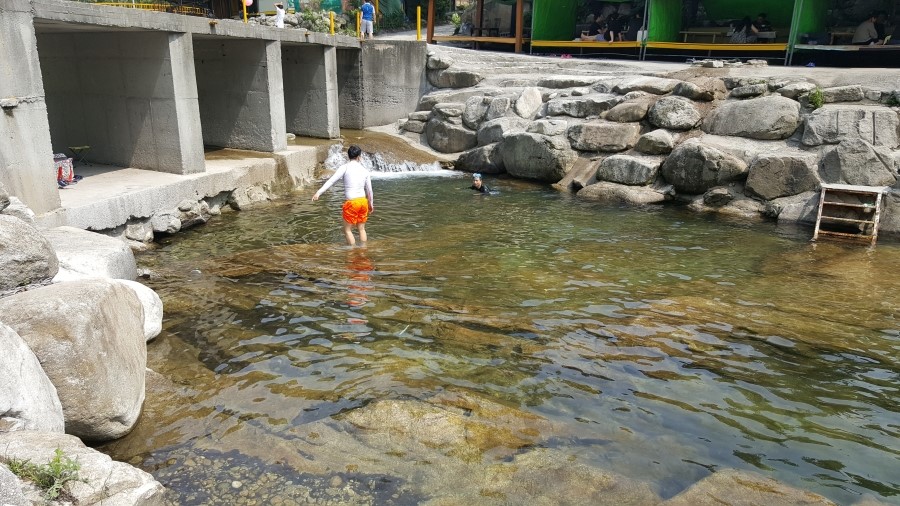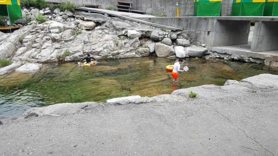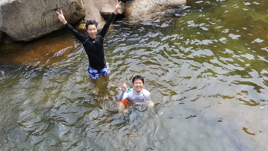 족구 후에는 백운계곡 필수 코스인 물놀이를 즐겼습니다. 비가 별로 안 올 때라서 물이 깨끗하지 않고 수심도 낮은 상태인데 한번 시원~하게 비 내리고 난 후에 가면 깨끗한 계곡물을 볼 수 있어요. 대신 수심도 깊어지지만. feat. 미소가 예쁜 내 친구들