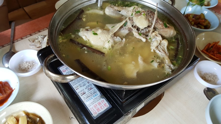 이미 좀 뜯은 상태의 사진이라 예쁘지 않지만 국물 맛이 진짜 끝내주는 고향산천 백숙은 진짜로 강추합니다. 음식 먹고 건강해진다라는 느낌을 제대로 느낄 수 있어요! 밑반찬이 맛있는 것은 기본이고요.