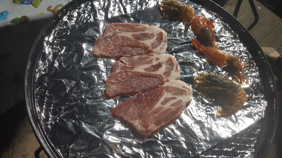 도착한 날 저녁에는 이렇게 펜션에서 고기를 구워먹었습니다. 불이 너무 약해서 고생은 좀 했어도 야외에서 먹는 숯불고기의 맛은 역시 실망시키는 법이 없었어요.