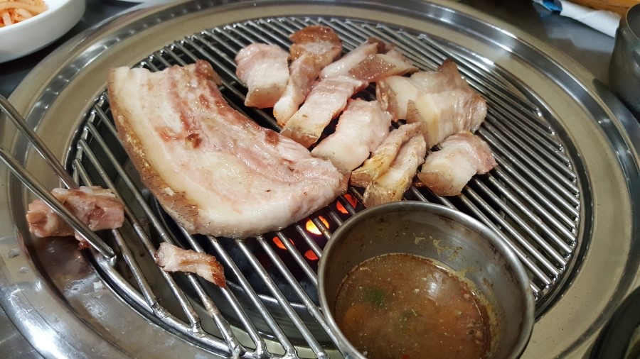 예전에 갔던 식당 중에도 여기가 있었던 것 같긴한데 잘 기억은 안 나고 어쨌든 오겹살을 먹을 수 있는 저팔계깡통연탄구이입니다. 저 소스와 함께 찍어먹으니 맛이 기가 막혔죠.