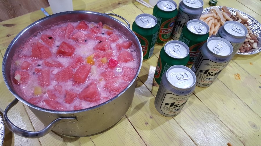 펜션으로 돌아와서는 엄청난 수박화채와 맥주, 안주들이 놓여졌습니다. 단체로 곡성을 보겠다고 준비했었는데 저는 너무 배부른 상태라 화채 한 그릇 먹고 영화는 못 보고 KO.