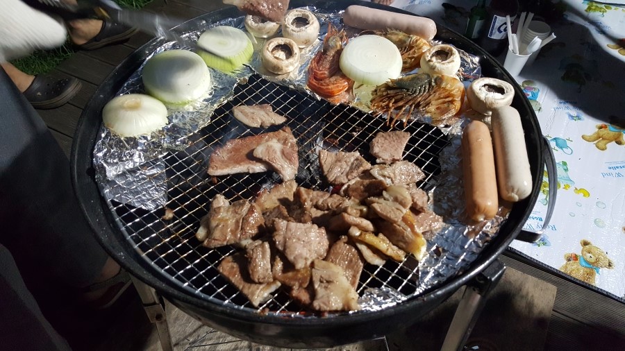 도착한 날 저녁에는 이렇게 펜션에서 고기를 구워먹었습니다. 불이 너무 약해서 고생은 좀 했어도 야외에서 먹는 숯불고기의 맛은 역시 실망시키는 법이 없었어요.