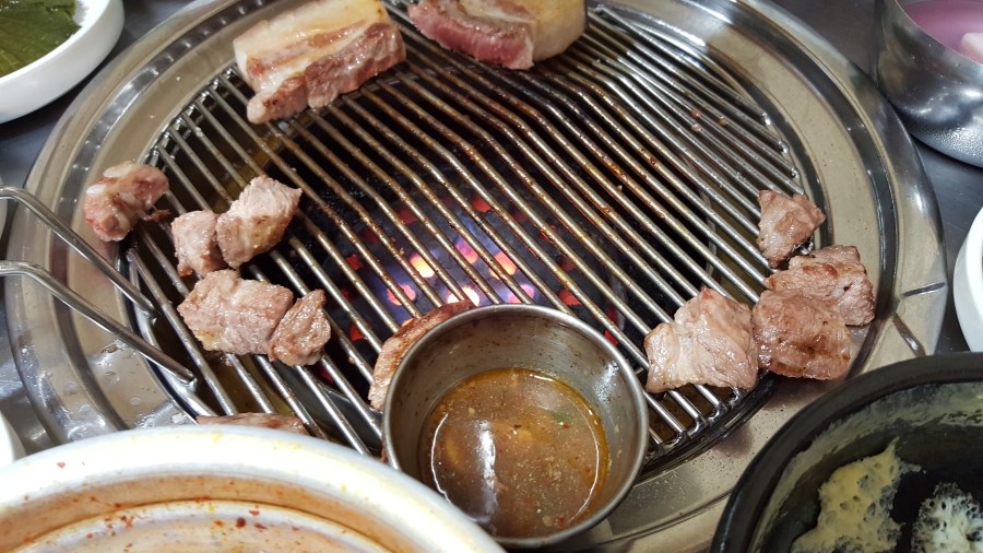 예전에 갔던 식당 중에도 여기가 있었던 것 같긴한데 잘 기억은 안 나고 어쨌든 오겹살을 먹을 수 있는 저팔계깡통연탄구이입니다. 저 소스와 함께 찍어먹으니 맛이 기가 막혔죠.