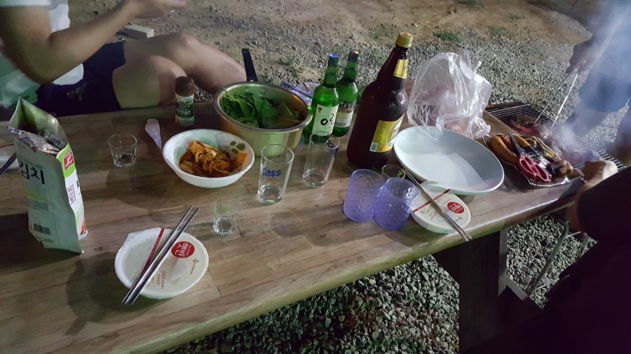 다들 피곤해해서 낮잠을 좀 즐긴 후 오후 8시쯤에는 저녁 준비를 했습니다. 펜션에서 술과 숯불 고기는 빠질 수 없는 것, (친구가 구워준) 삼겸살과 목살, 소세지 구이는 언제나처럼 맛있었네요.