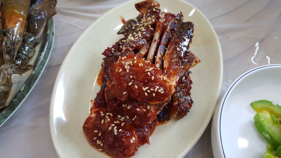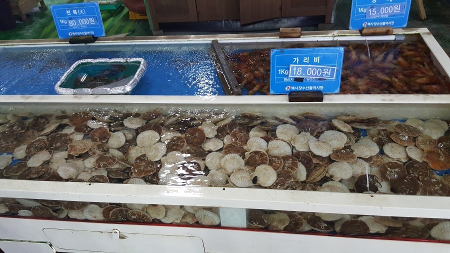 마트에서 장을 본 다음에는 회를 사기 위해 안면도 수산시장에 들렀습니다. 근데 회는 비싼 느낌이라 패스하고 게-새우튀김만 먹었는데 게튀김 그게 뭐가 맛있는건지 불평불평하면서 이후에 회는 다른 통합횟집(?)에서 우럭+광어 조합으로 샀습니다.