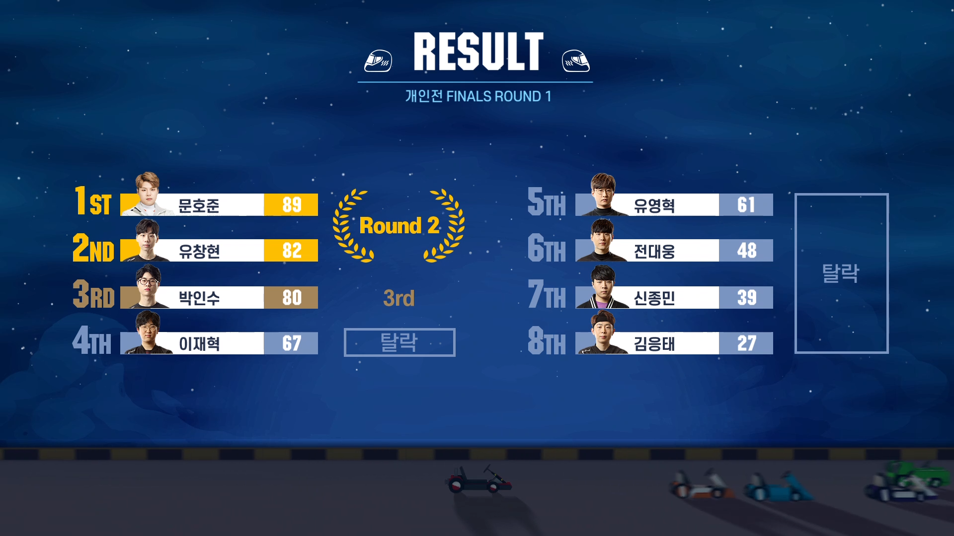 이렇게 역사적인 마르세유 턴으로 1위(89pt)를 달성한 문호준과 결승 내내 안정적인 주행과 순위로 2위(82pt)를 달성한 유창현 2인이 최종전 진출에 성공했습니다. 개인적으로는 최초로 80pt를 달성하고 떨어진 선수로 기록된 박인수가 아쉬웠어요.