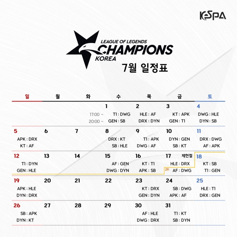 2020 LCK(리그오브레전드 챔피언십 코리아, 롤챔스) 서머 일정이 공개되었습니다. 여전히 많은 LCK팬들이 2020 MSC 참패에서 벗어나지 못하고 있는 분위기이지만 그래도 리그는 계속 이어가야죠! 2020 LCK 서머 개막일은 6월 17일이고 샌드박스 vs 아프리카, DRX vs T1 매치가 준비되어 있습니다.