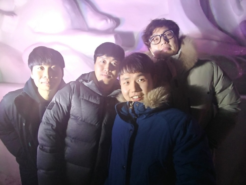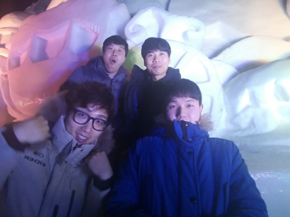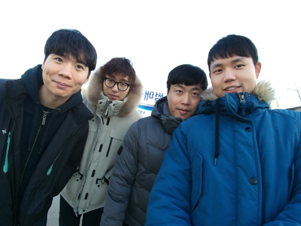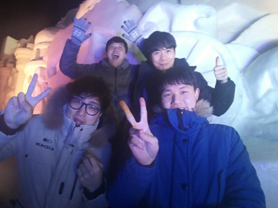 산천어축제 현장에 도착하자마자 중간거인 4인 인증사진을 찍었습니다. 날씨가 너무 추워서 손이 차더라도 빼놓을 수 없는 사진이니까요.