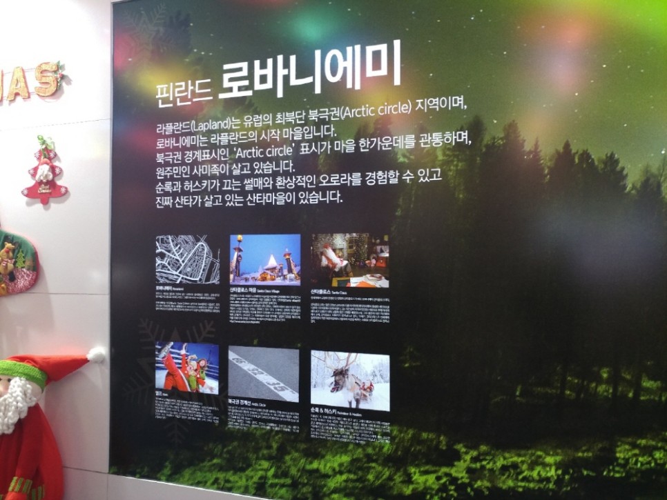 개인적으로 크리스마스 건물이라고 명명한 곳에 들어갔더니 이렇게 예쁜 장식들로 꾸며져 있더라고요. 핀란드의 로바니에미라는 산타마을 소개도 있었습니다.