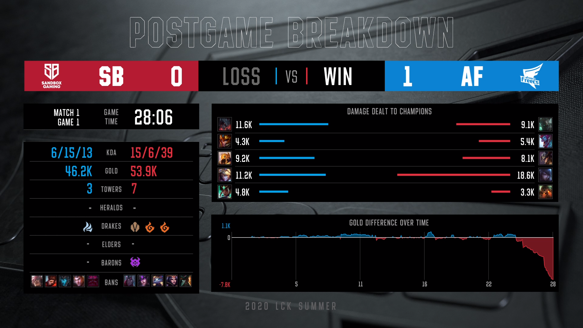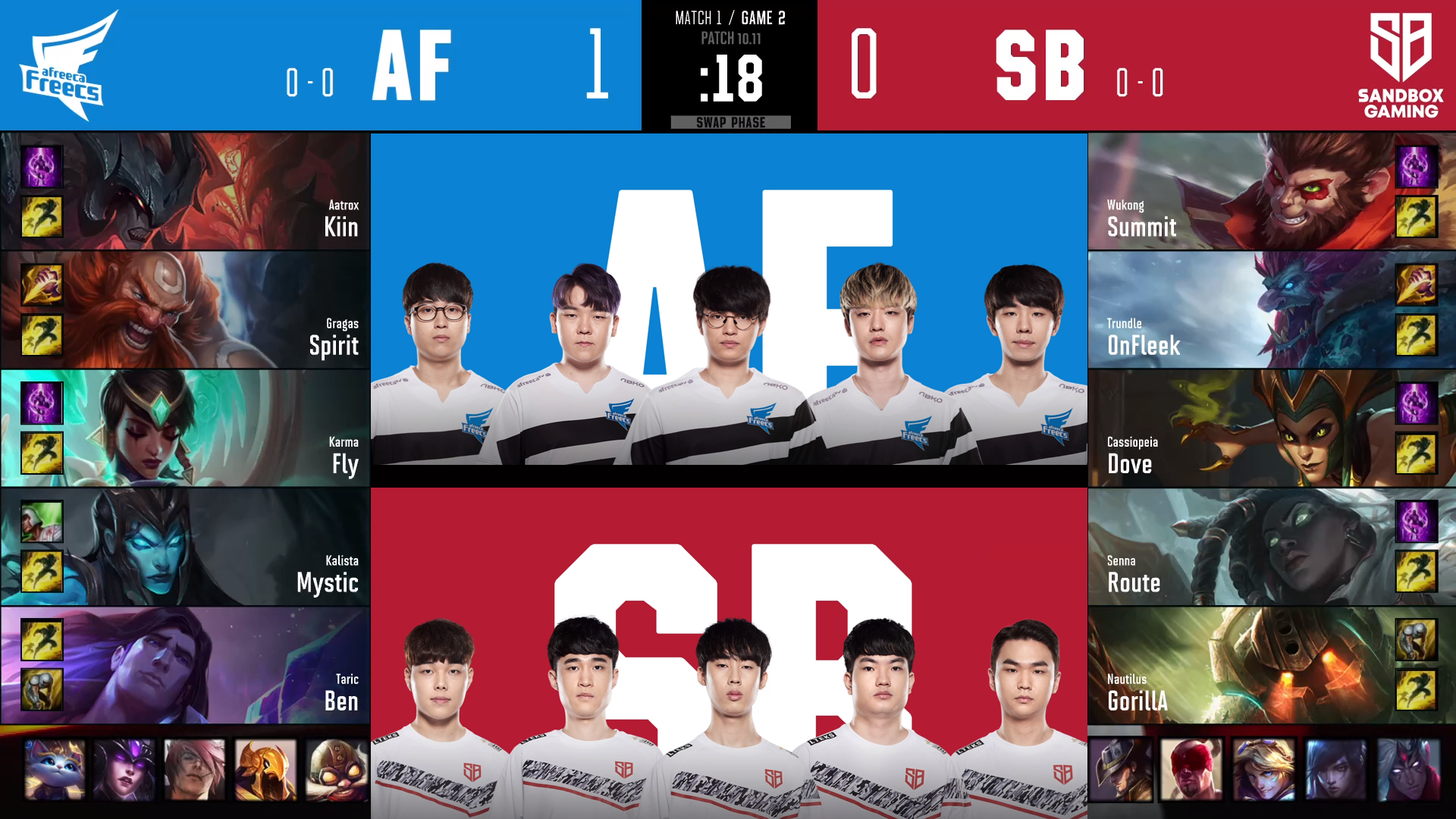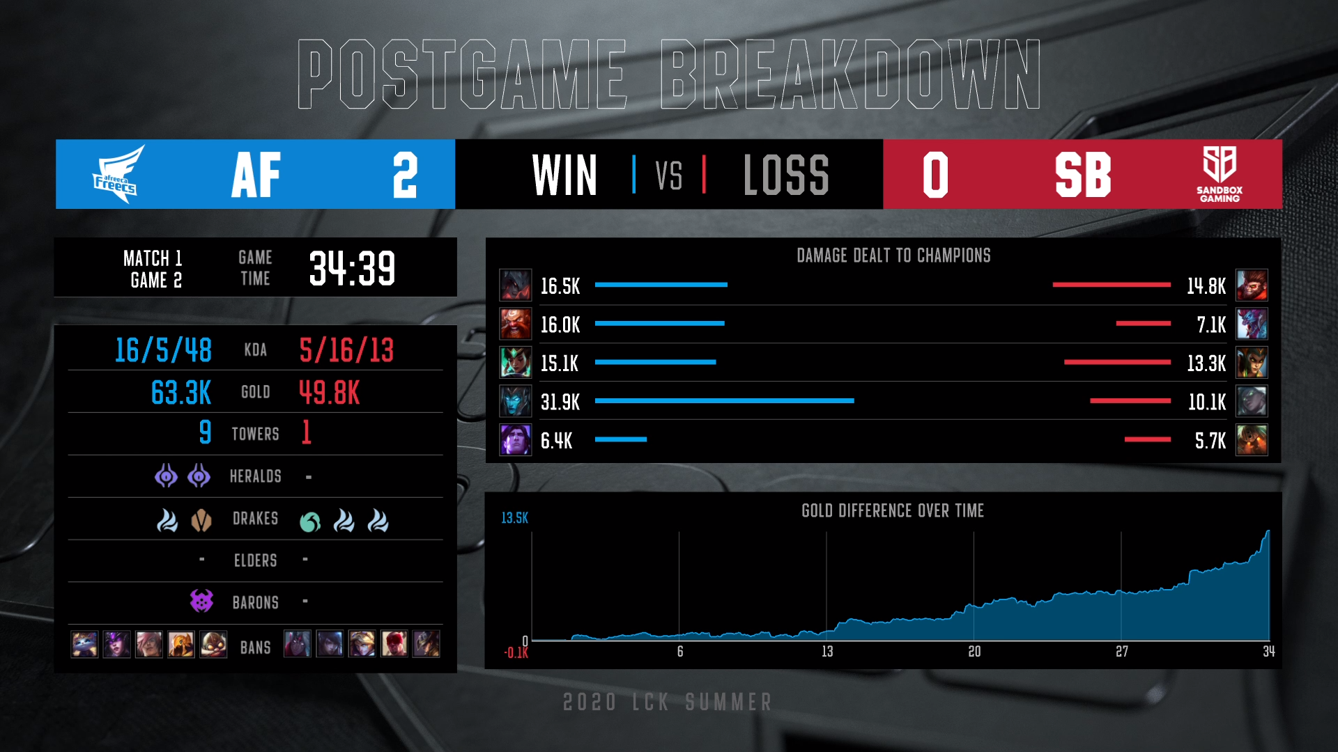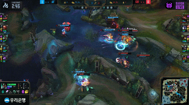 1경기 초반은 나름 비슷하게 흘러가는 양상에서 아프리카가 주도권을 조금씩 잡아가는 흐름이었습니다. 샌드박스가 조금씩 자신들이 해야할 플레이를 놓치고 있었는데 아프리카의 펜타킬 한타가 확실한 승리를 결정지었네요.