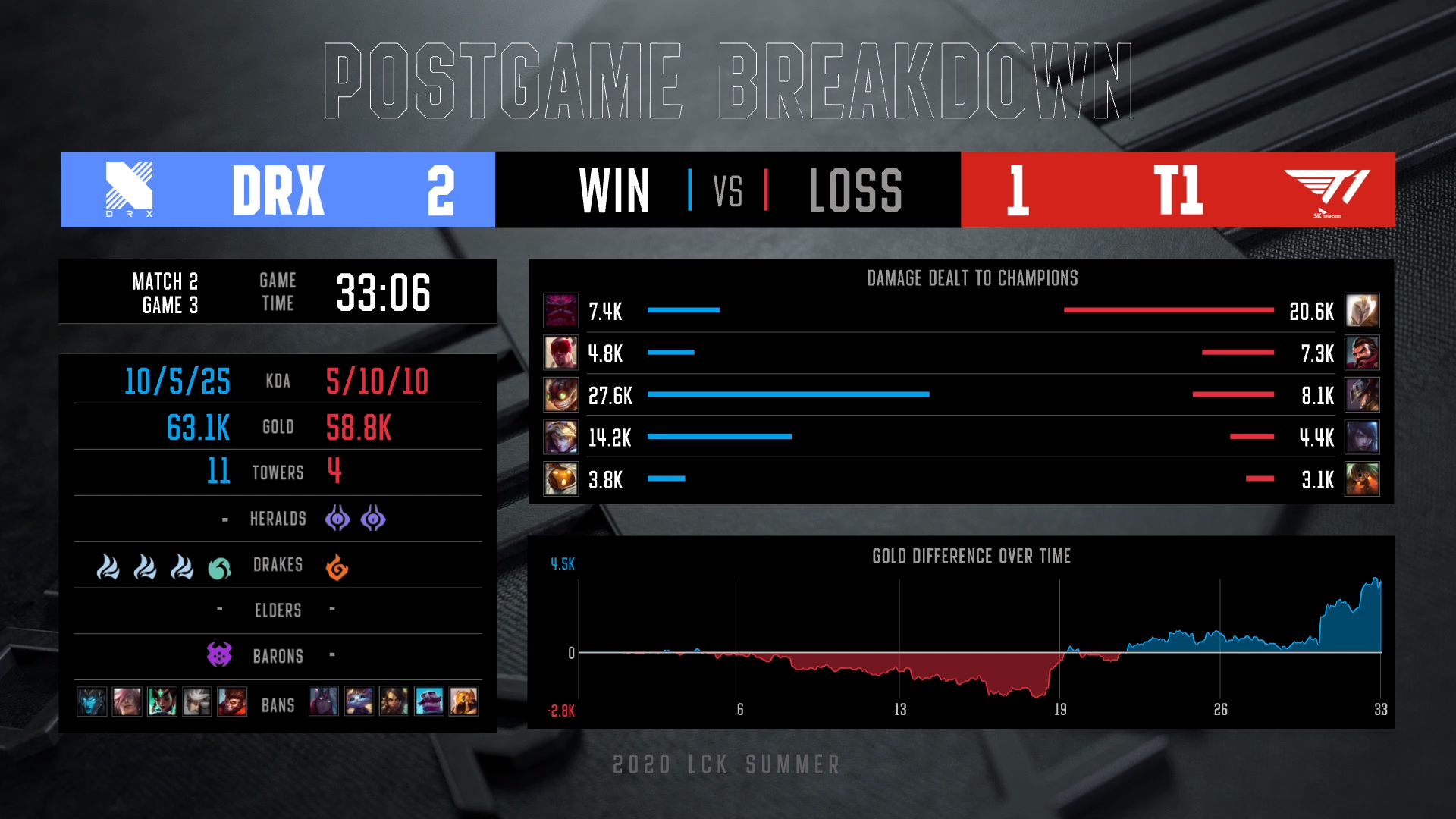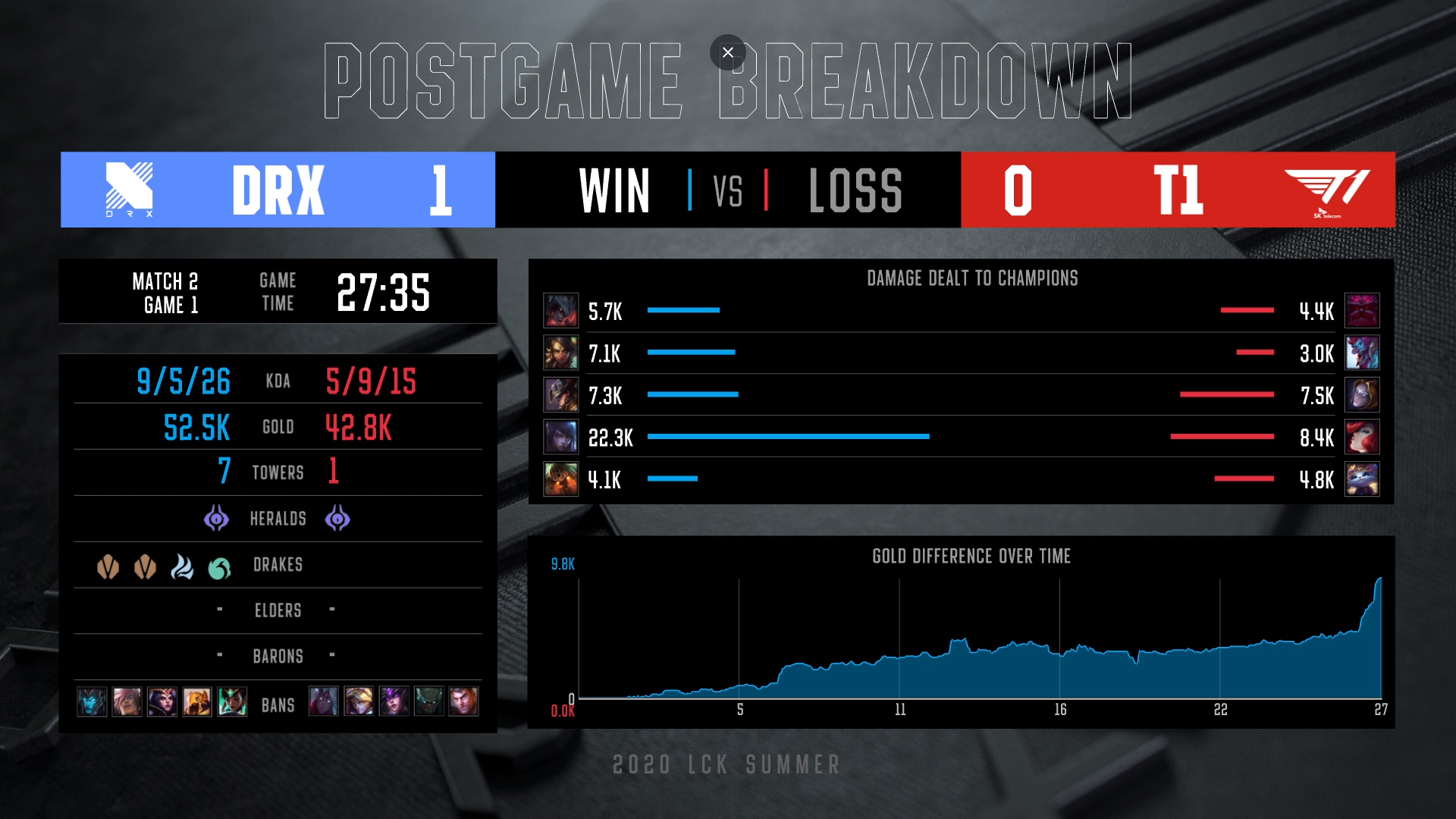 2020 LCK 서머 개막일 경기는 이렇게 아프리카와 DRX가 승리팀이 되면서 끝났습니다. 기대 이하의 경기력이 나와서 아쉬움이 남은 것도 사실이지만 앞으로 나아질 것이 확실하니 각자 좋아하는 선수들과 팀에 대한 따뜻한 응원과 함께 이번 시즌도 재미있게 지켜보자구요~다시 한 번 국제 대회 정상에 올라서는 LCK팀이 탄생하길 바라며.