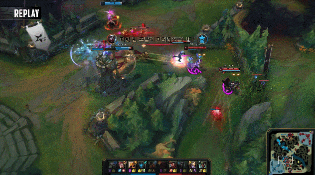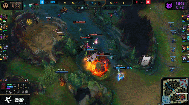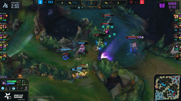 전체적으로 DRX의 흐름이 좋지 않았지만 케리아가 해냈습니다. 차원문을 통과한 케리아의 바드가 상대 그레이브즈와 트페를 따닥으로 묶는데 성공하면서 경기 흐름이 완전히 역전되어 버렸어요.
