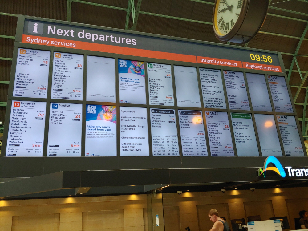 호주 시드니 전철이라고 하는게 맞을까요? 어쨌든 무슨 역이었는지 지금도 모르겠는데...ㅋㅋ 한 눈에 목적지를 알 수 있도록 이렇게 큰 전광판이 있더라고요.