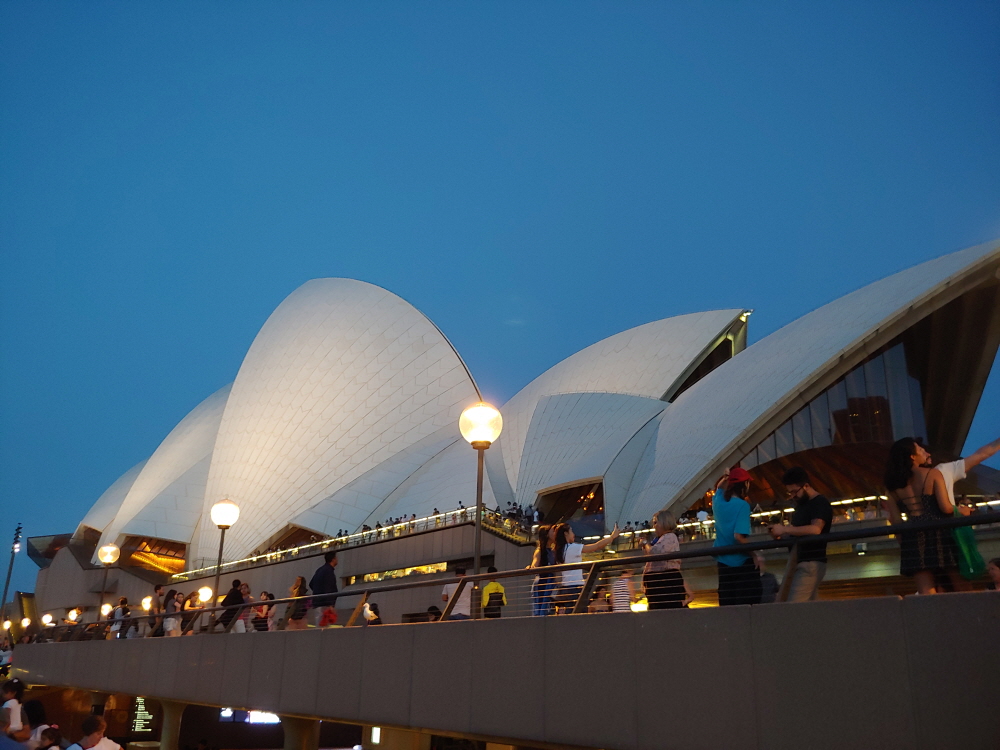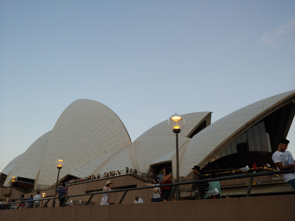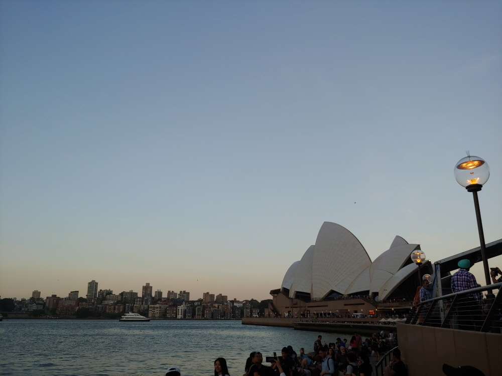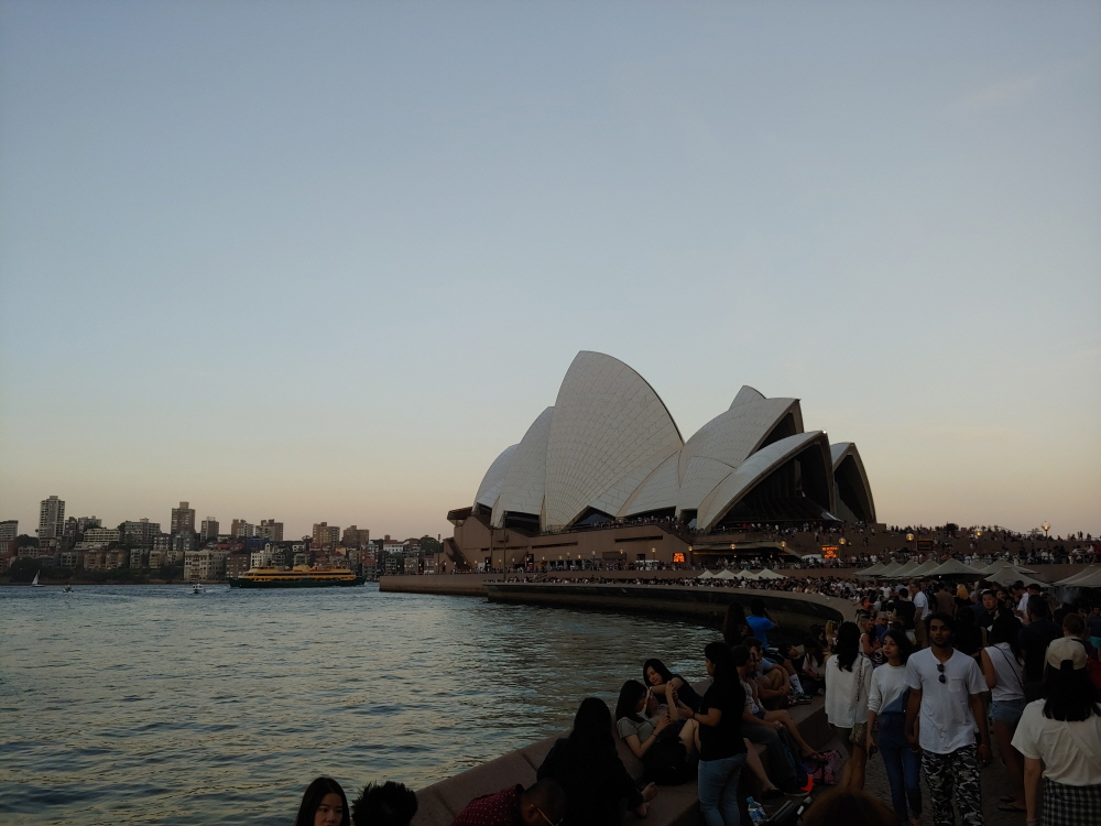 많은 사람들 사이를 파고들며 길을 계속해서 가다보니까 드디어 호주 시드니의 랜드마크 오페라하우스(Opera House)가 눈에 들어왔습니다. 이미 전날에만 해도 여기를 배경으로 열심히 사진 찍었지만 좀 더 가까이 다가가서 어둑해진 하늘 아래에서 눈에 들어온 모습은 또 색달라 보였어요.