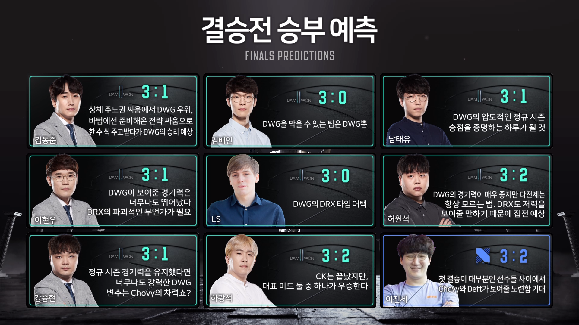 이번에도 관계자 예상은 담원의 우승으로 치우쳤습니다.우리나라 관계자 예상은 너무 뻔한것 아니냐는 비판도 봤지만 객관적인 지표를 바탕으로 주관을 담아 예상하는 것인데 체급이 비슷한 경기가 아니라면 오히려 이게 당연한거 아니겠어요? 이전에도 젠지 우세가 분명했지만 DRX가 당일 경기에서 더 잘했을뿐.