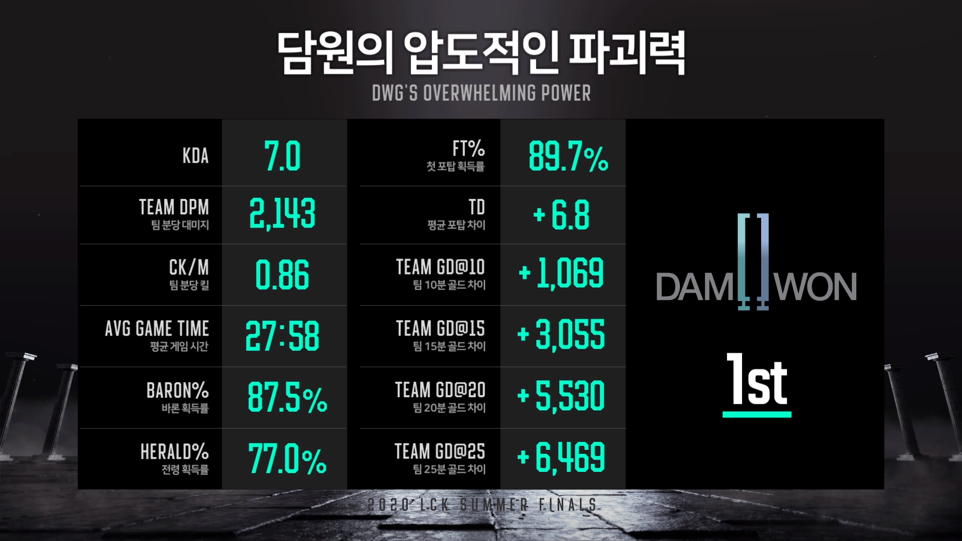 그렇지만 이번 시즌 담원은 지표만 봐도 미쳤어요. 그냥 말도 안되는 경기력으로 1위 지표를 싹쓸이한 담원의 우승을 그 누가 의심했을까요? 특히, 담원의 평균 게임 시간이 짧은 것은 알고 있었지만 27분대까지 기록했을줄은 몰랐네요.
