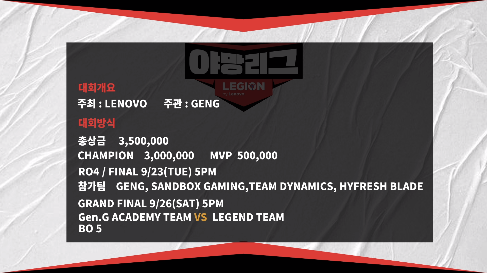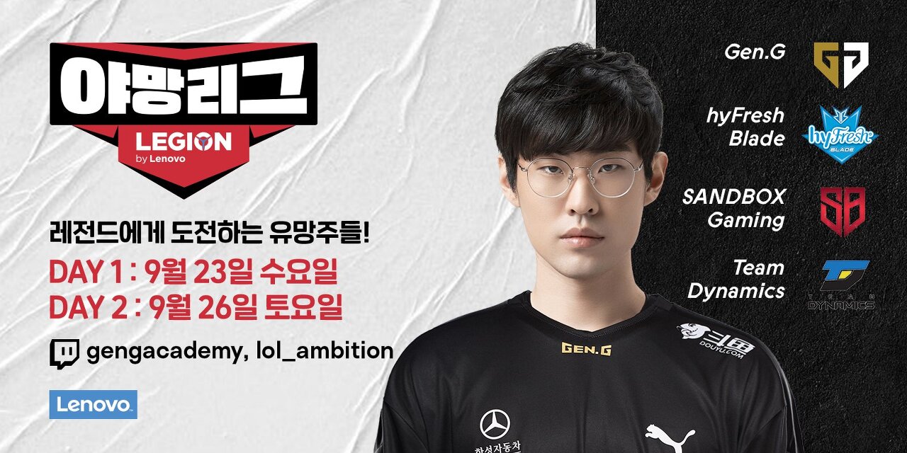 앰비션이 젠지와 함께, 그리고 레노버 리전의 후원을 받아 준비한 야망리그입니다. 최근 롤더넥스트도 그렇고 LCK 프랜차이즈를 앞두고 미래의 LCK 스타를 미리 만날 수 있는 이런 이벤트가 많아지는 것은 긍정적인 일입니다.