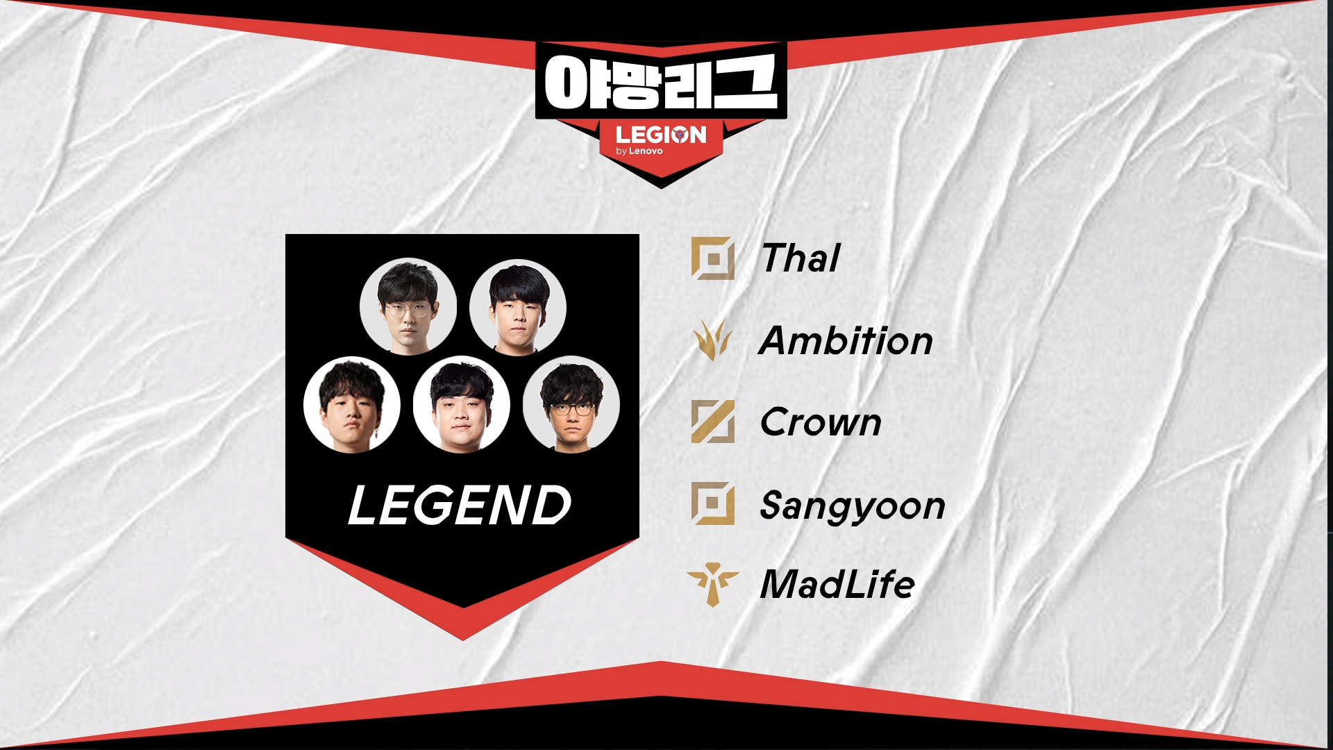 레전드팀의 중심 앰비션을 필두로 트할, 크라운, 상윤, 매드라이프가 한 팀으로 뭉쳤습니다. 재미있는 팀이 탄생했지만 다들 경기력이 최고였던 라떼 시절에서 벗어나 있었기 때문에 이길 것 같지는 않았어요. ㅋㅋㅋㅋㅋ