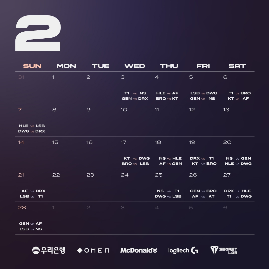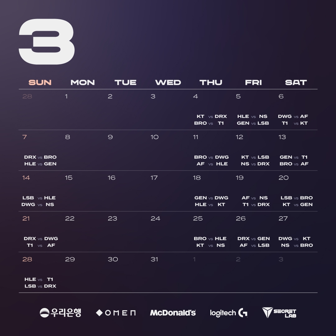 스프링 경기일정은 이렇게 나왔습니다. 우선은 개막일인 13일 펼쳐지는 매치인 젠지 vs KT 롤스터, T1 vs 한화생명e스포츠만 확인해두면 될 것 같아요.