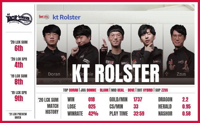 지난 해 롤드컵이 끝난 후부터 2021년 LCK 스프링을 얼마나 기다렸는지 모르겠습니다. 올스타전은 제 예상보다 재미있었고 맛보기 케스파컵도 있었지만, 역시 롤드컵이 끝난 다음 가장 큰 만족감을 주는 롤 대회는 LCK뿐이거든요. 각각의 팀이 이번 시즌을 위해 갈고 닦았을테니 새로운 유니폼을 입고 멋진 경기력을 보여줄 선수들을 함께 기다려보아요.