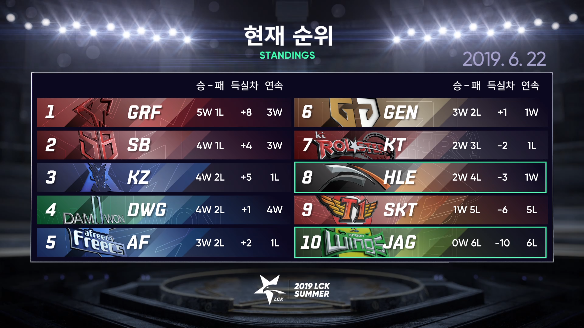 2019 LCK 서머시즌 6월 22일의 매치는 그리핀 vs SKT, 그리고 한화와 진에어였습니다. 각자 팬들의 바람과는 별개로 아마 많은 사람들이 최근의 경기력을 바탕으로 승패를 예측할 수 있었던 매치였는데 결과는 역시 예상대로였습니다. SKT의 몰락과 진에어의 연패 기록이 이어진 결과 말이죠.