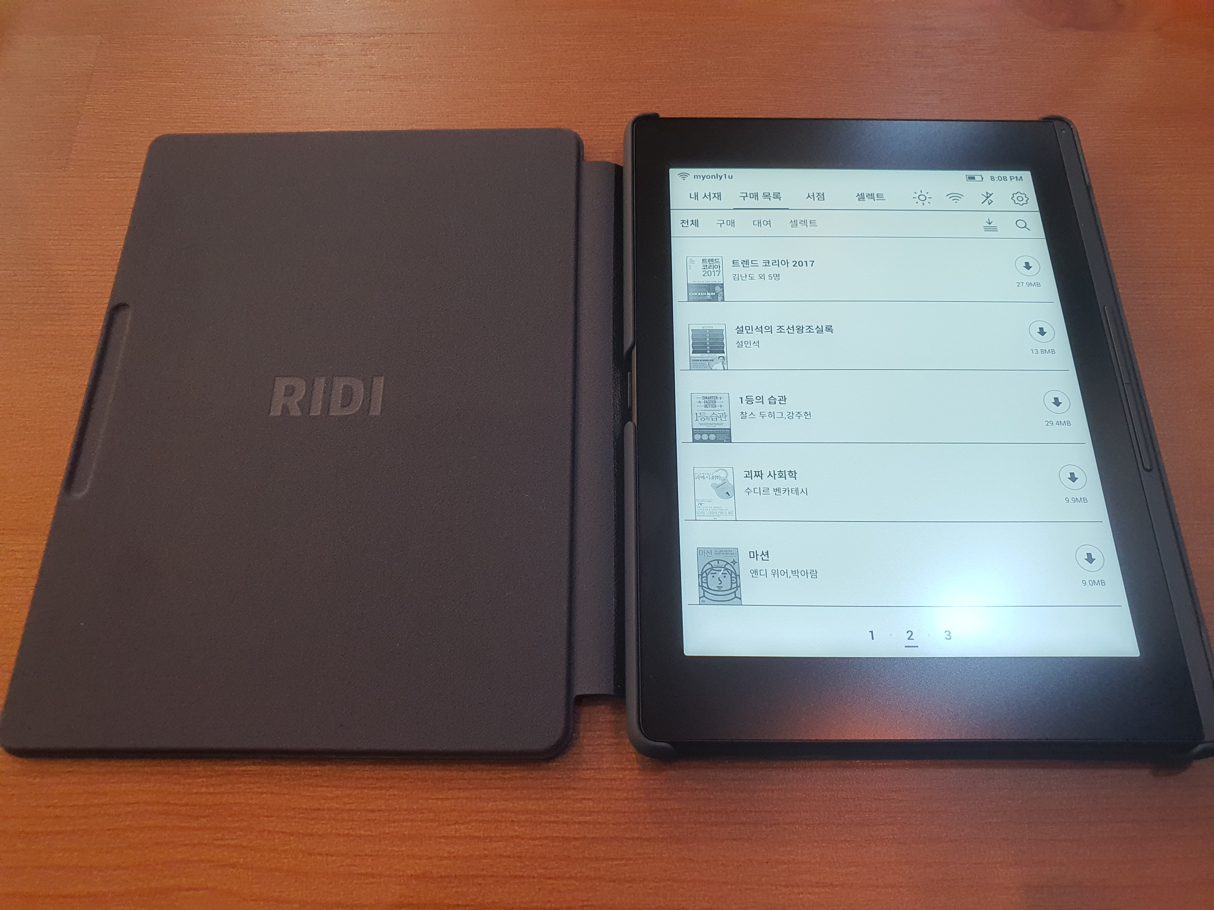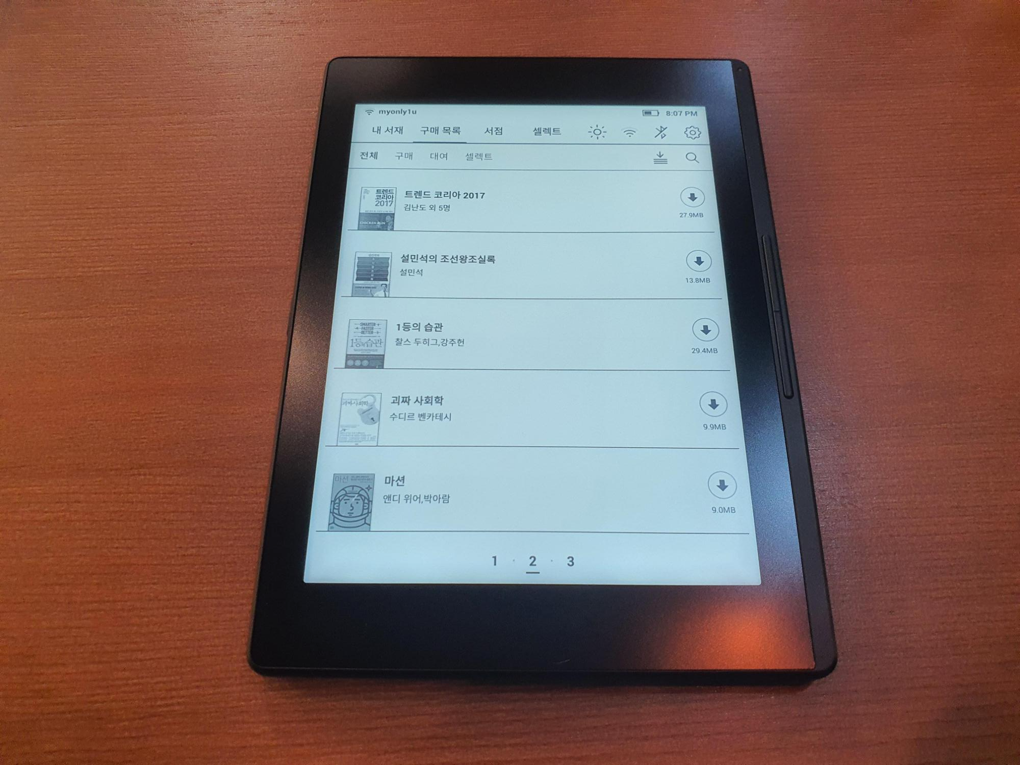 리디페이퍼를 실행 시킨 후 와이파이를 켜서 로그인 하니까 예전에 구입했던 이북 목록을 이렇게 확인할 수 있었습니다. 예전에 별로 안 썼다고 생각했는데 그래도 이렇게 3페이지나 있었네요. ㅋㅋ