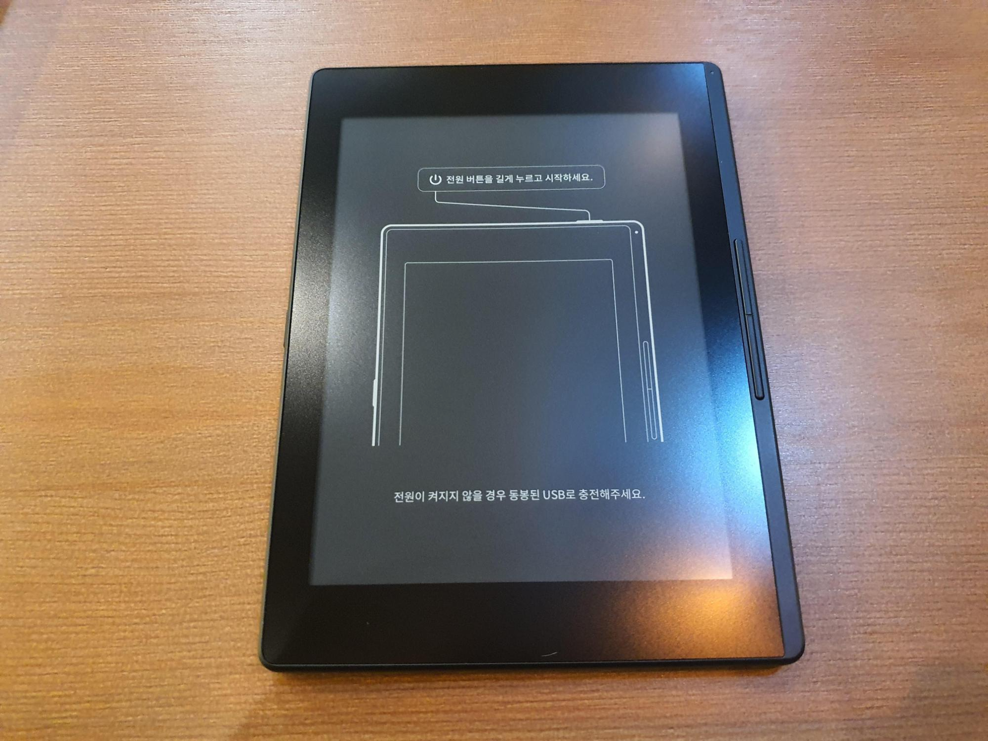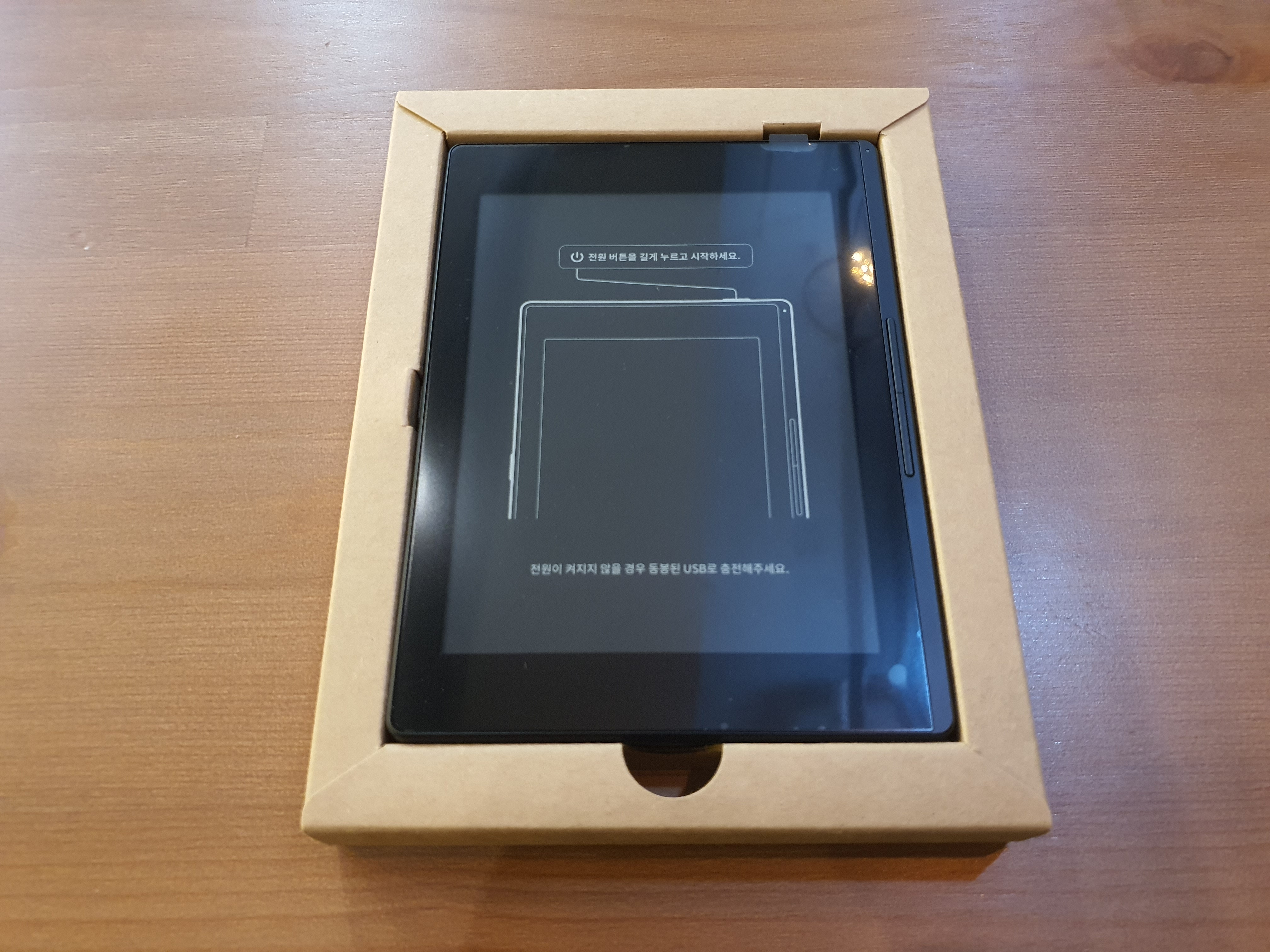 겉에 붙어있는 필름을 뗀 후니까 이제 리디페이퍼 본체 전원 버튼만 누르면 되는 상황입니다. 그래도 저는 예전에 써 본 적이 있어서 보자마자 나름 익숙했어요. 저는 이전 모델을 써 본 것이긴 하지만요.