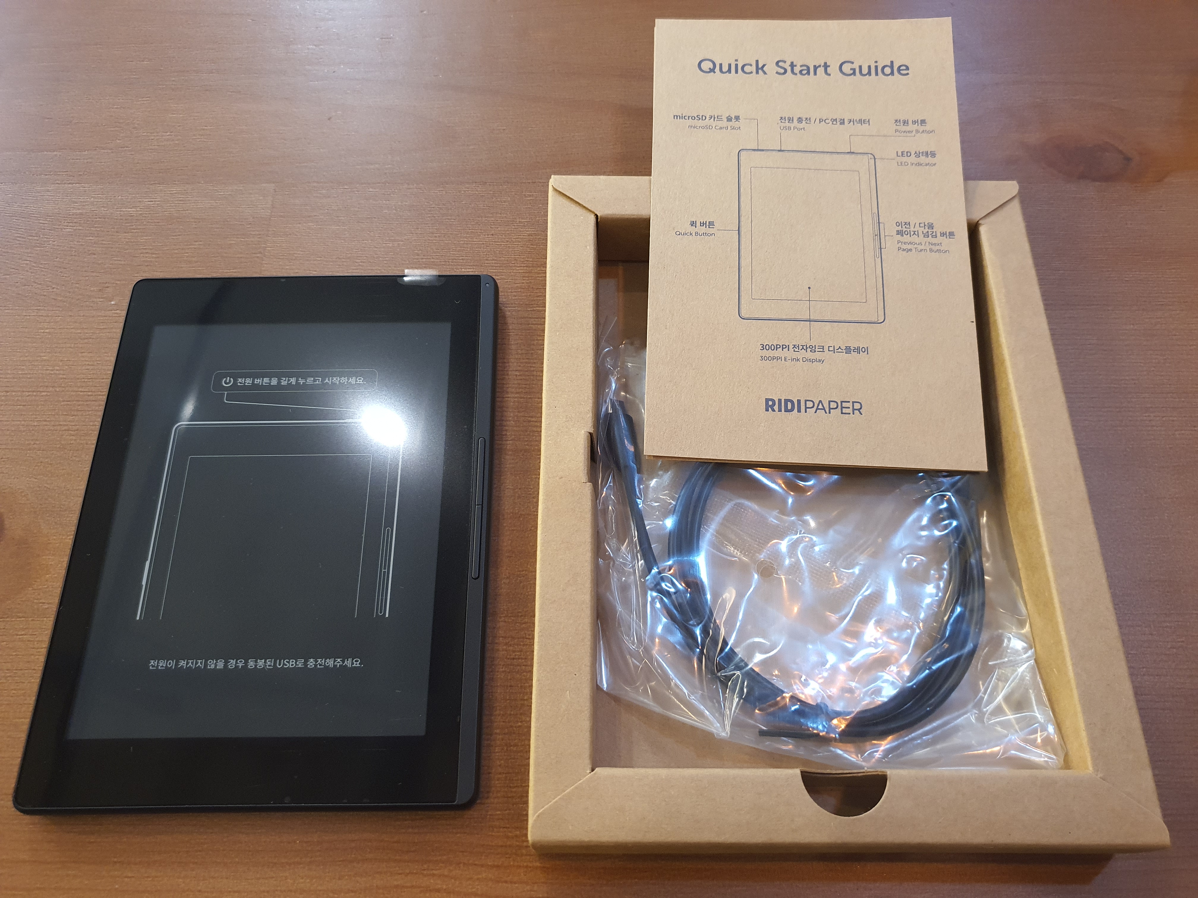 그리고 리디페이퍼 본체를 들어보면 안에 간단한 설명서와 마이크로 5핀 충전 케이블이 들어있습니다. 이북리더기에 엄청나게 대단한 기능이 들어 있는 것은 아니기에 이 정도면 충분해요.
